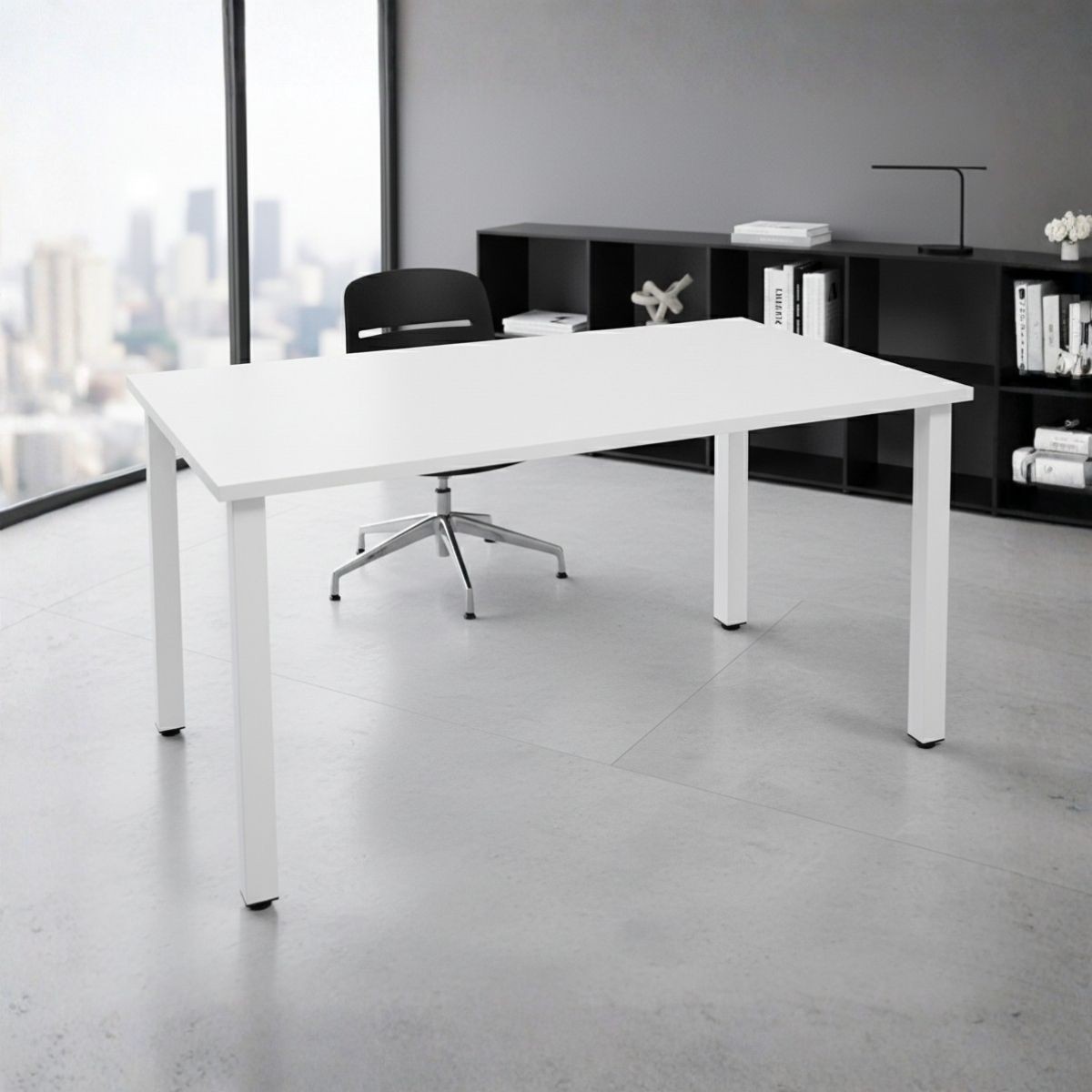 La estructura metálica de cuatro patas blancas atornilladas refuerza la estabilidad y aporta un aire ligero y contemporáneo. Gracias a su diseño simple y robusto, la mesa se integra con facilidad tanto en espacios corporativos como en zonas de teletrabajo.