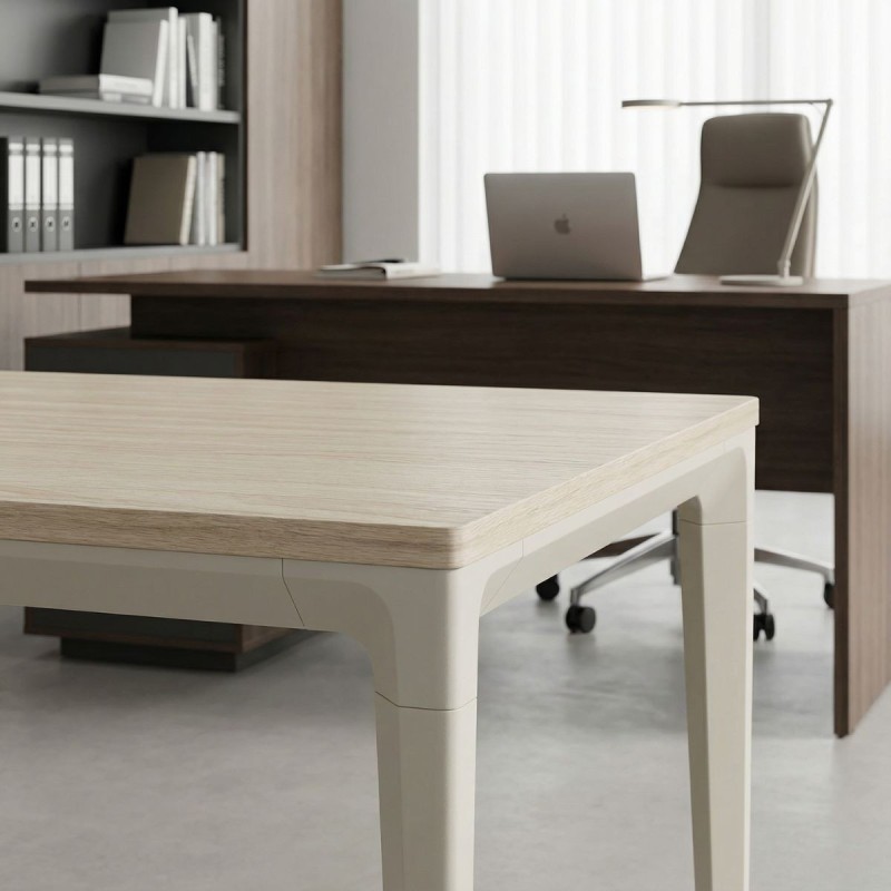 Su estructura incorpora 4 patas metálicas en acabado blanco, que aportan estabilidad, durabilidad y una estética limpia y actual. El tablero de madera en acabado alpin proporciona una superficie robusta, elegante y fácil de integrar en cualquier estilo de oficina, desde ambientes minimalistas hasta espacios más cálidos.