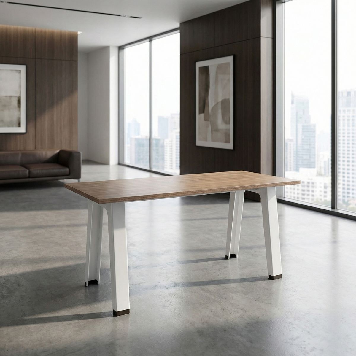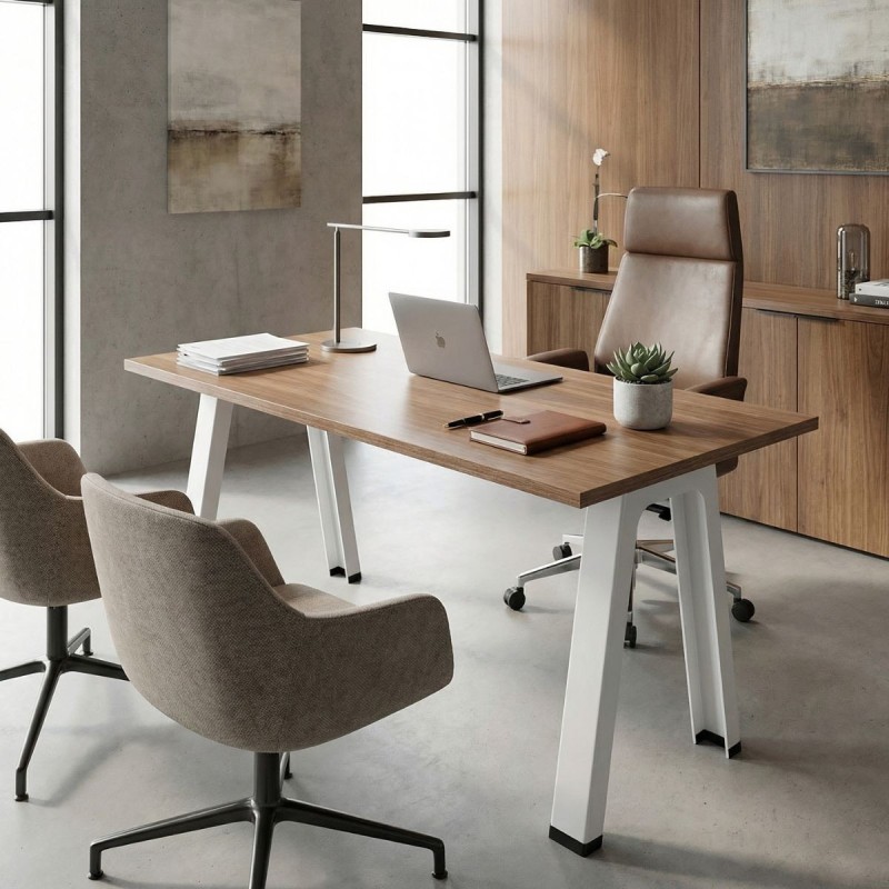 Mesa de diseño contemporáneo con una estructura sólida y elegante, perfecta para oficinas modernas, zonas de trabajo colaborativo o espacios administrativos. Su base de 4 patas metálicas en acabado blanco aporta estabilidad, resistencia y un estilo limpio que combina con cualquier entorno profesional.