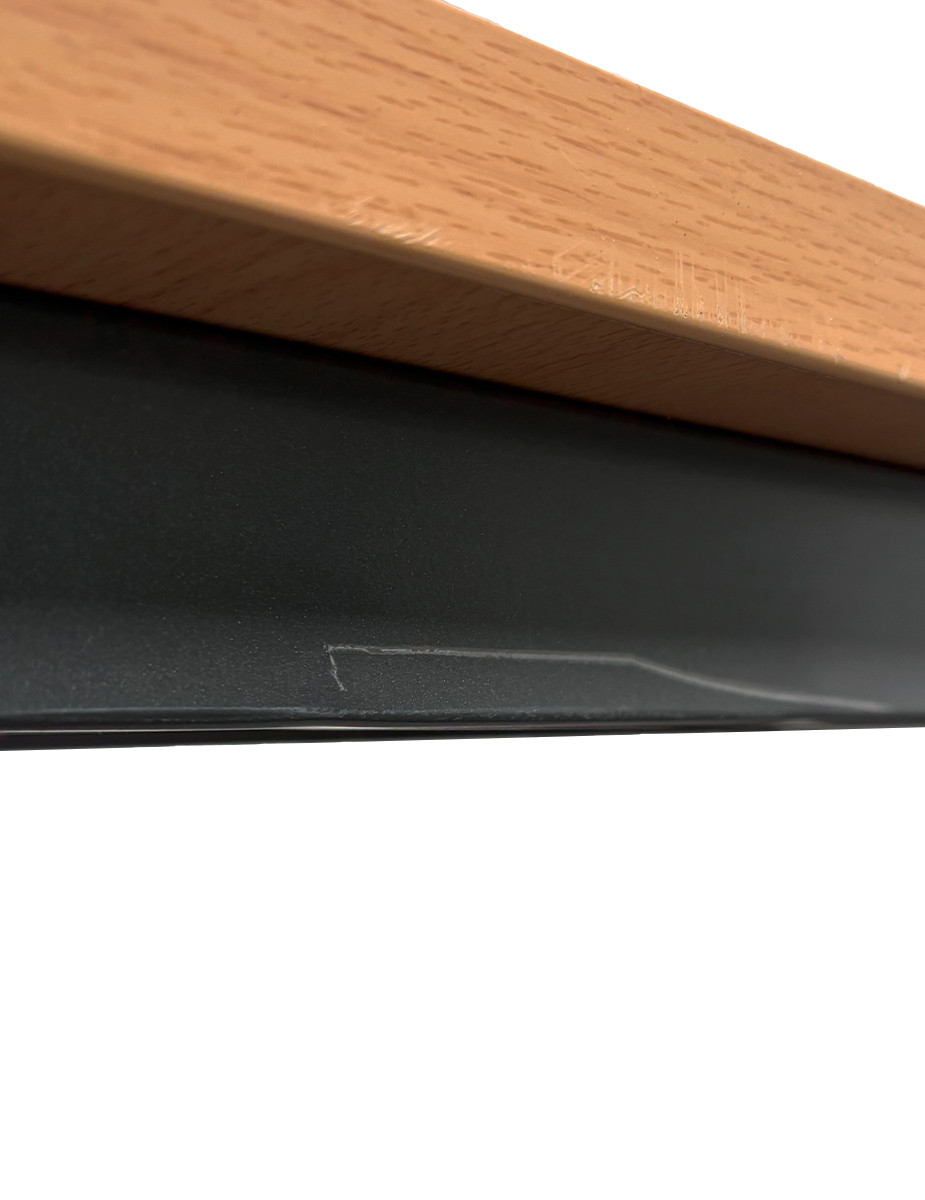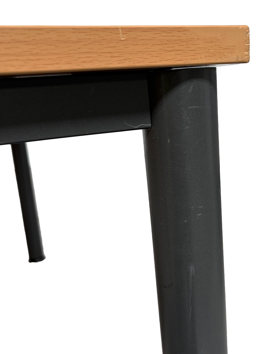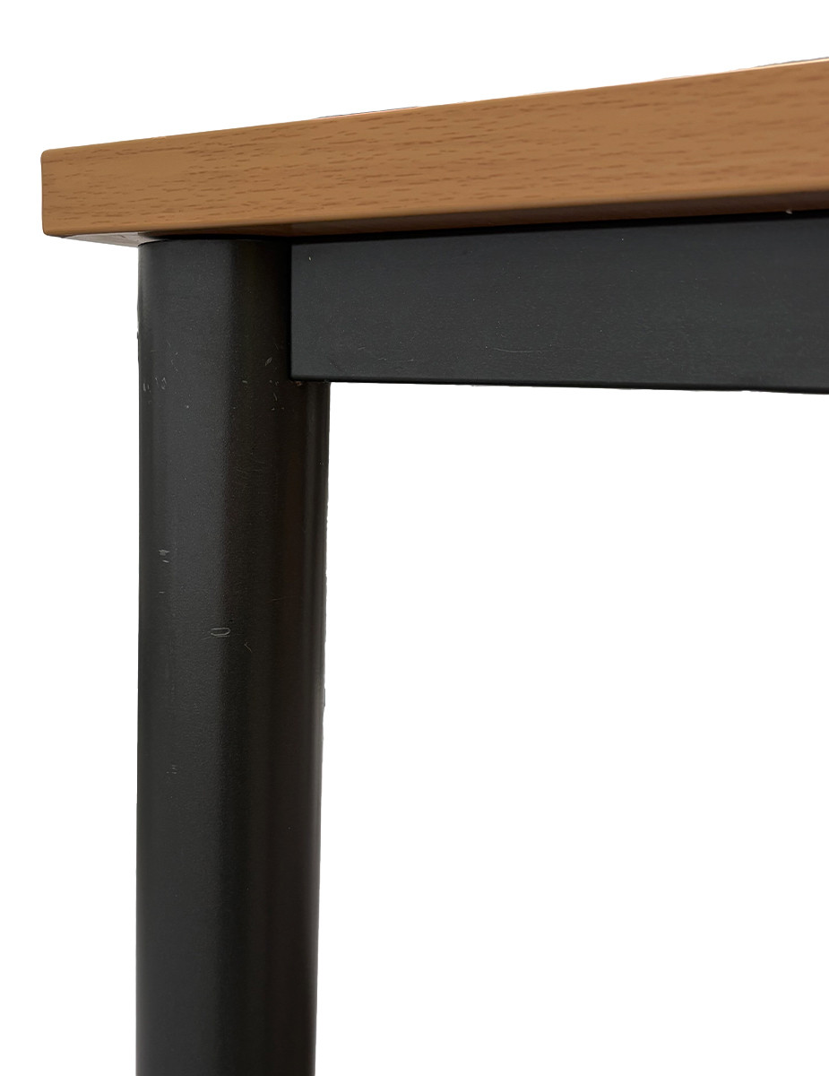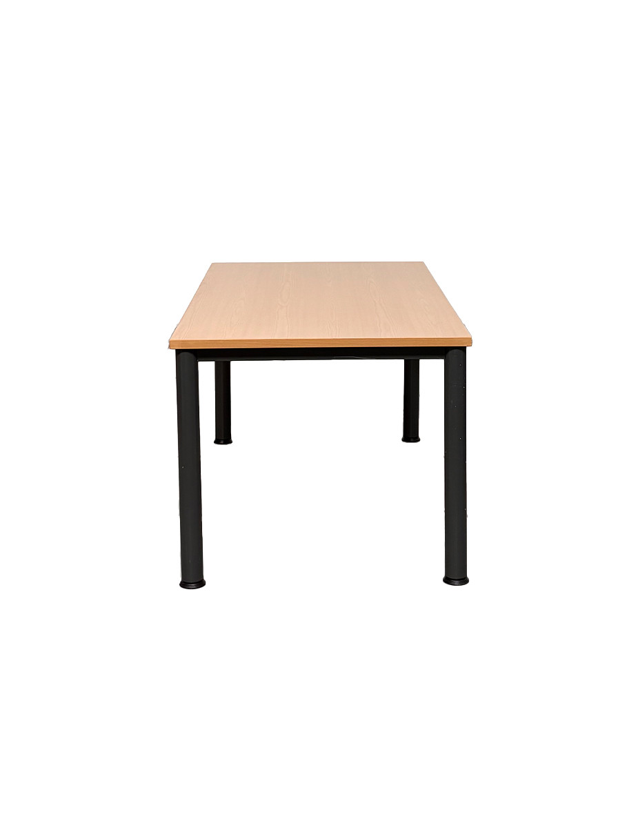 El tablero de melamina en acabado haya aporta calidez y luminosidad al espacio, manteniendo una estética profesional y versátil. La estructura está fabricada en metal acabado grafito, garantizando estabilidad y durabilidad en entornos de uso continuo.
