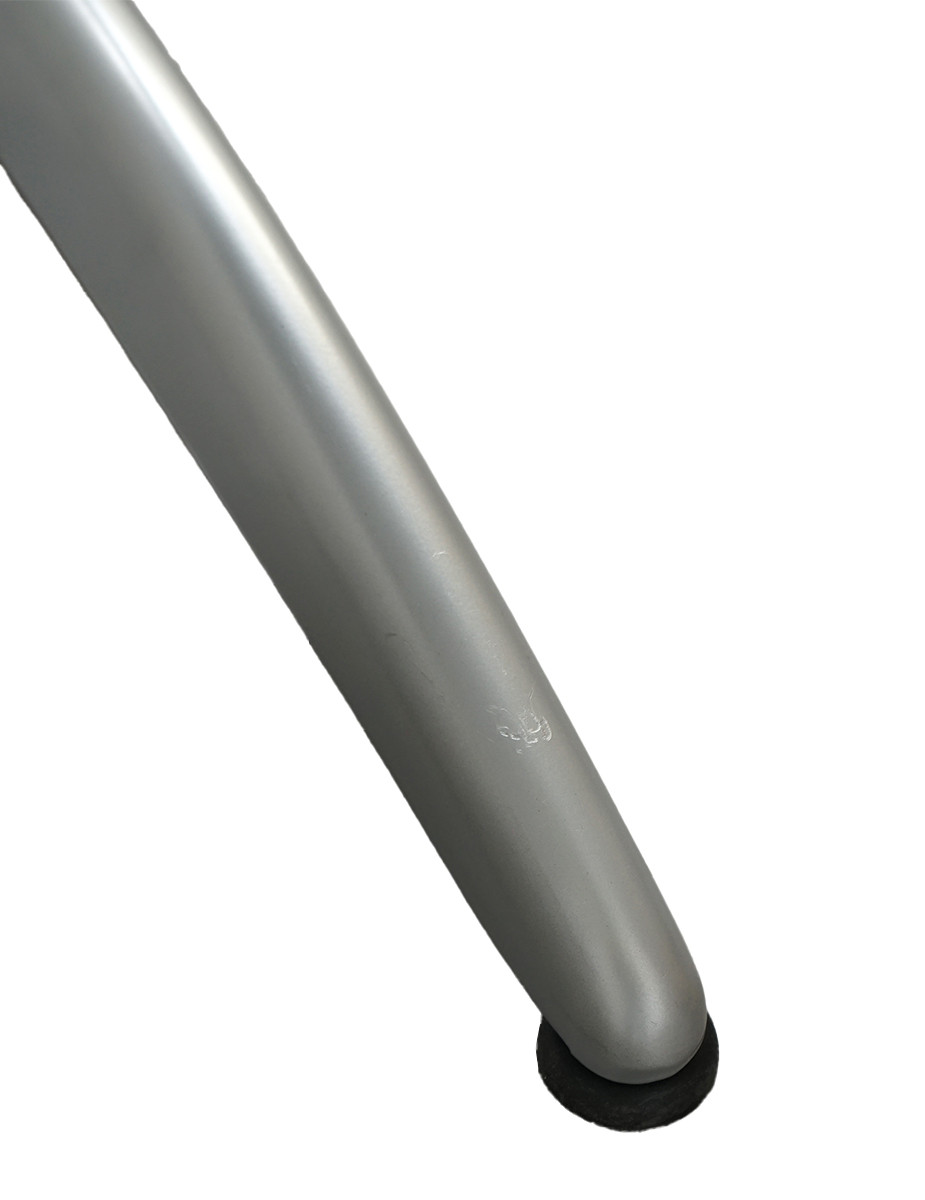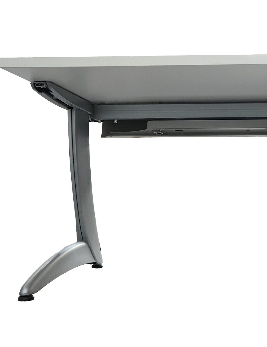 El tablero de melamina en acabado gris aporta resistencia al uso diario y una imagen sobria que encaja fácilmente en oficinas modernas, espacios corporativos o entornos colaborativos. Las patas arqueadas metálicas en acabado gris no solo refuerzan la estructura, sino que añaden carácter visual y estabilidad al conjunto.