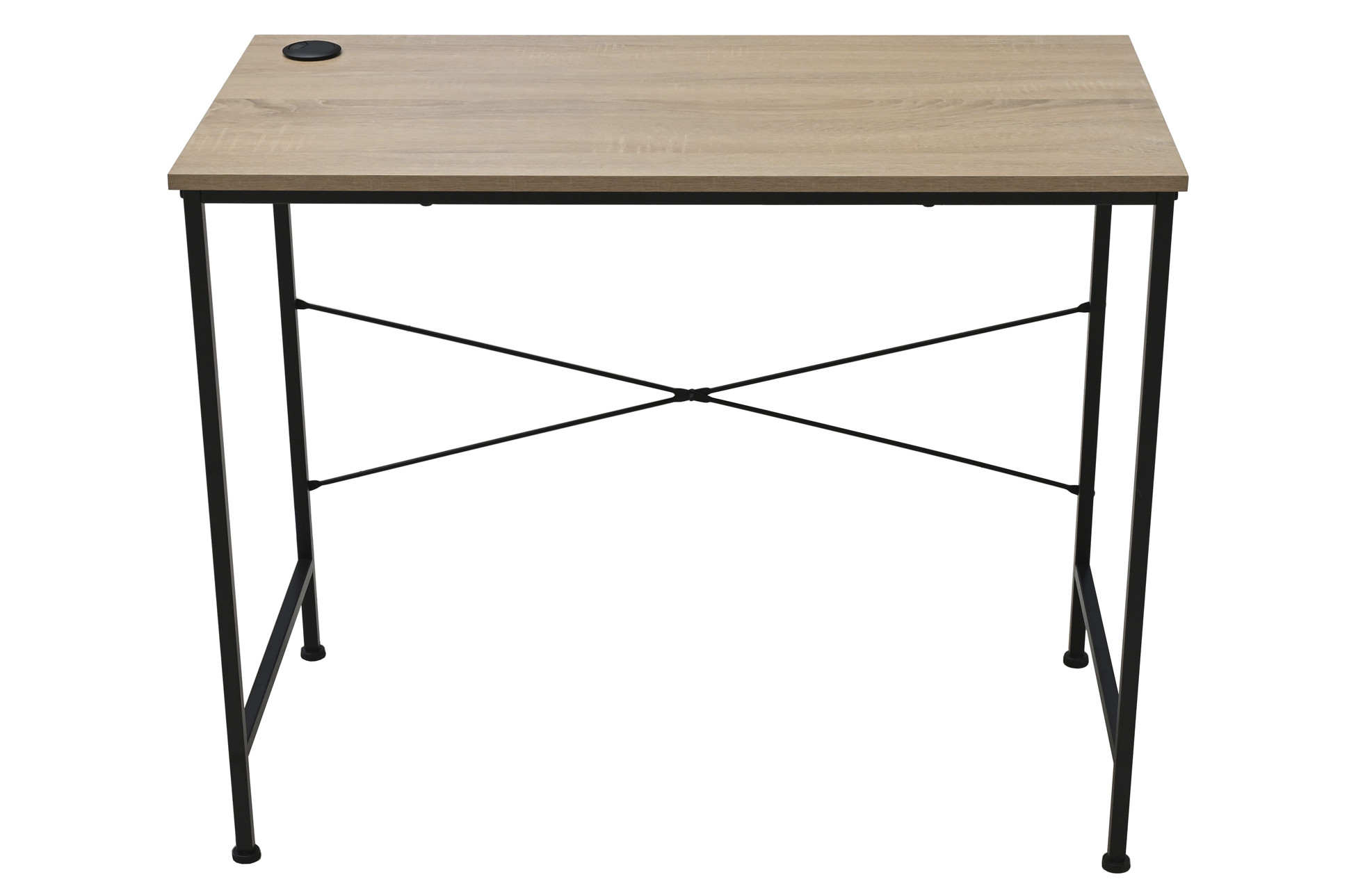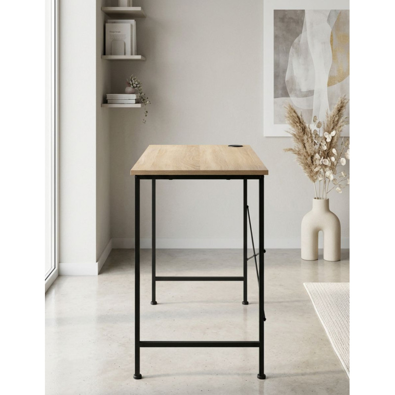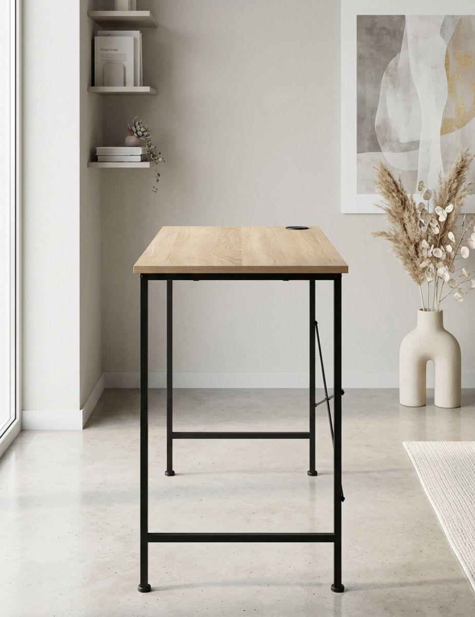 Cuentan con una estructura metálica en acabado negro, que aporta estabilidad, resistencia y un toque contemporáneo. El tablero de melamina en acabado roble añade calidez y elegancia, creando un contraste atractivo que encaja fácilmente en diferentes estilos decorativos.