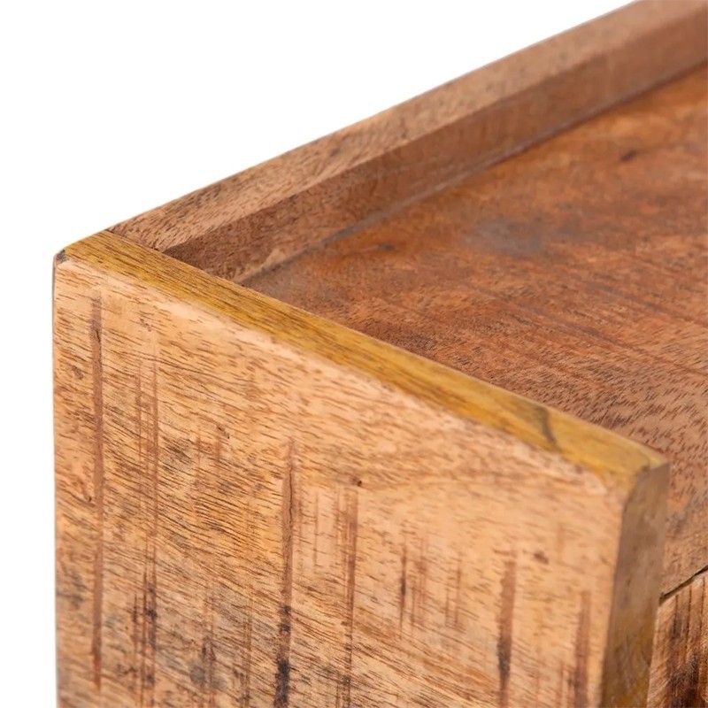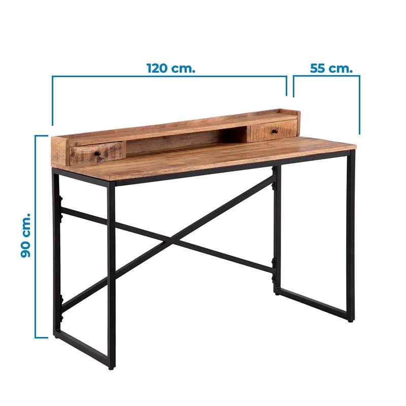 Tiene un tablero de madera de mango en acabado natural, este material es conocido por  ser duro y resistente. También, tiene una apariencia atractiva con un aspecto cálido y natural que puede agregar belleza y elegancia a cualquier espacio. La veta de la madera es única, lo que le brinda a la mesa un aspecto distintivo y atractivo. Además, es resistente a la humedad. Ésta cuenta con una tabla adicional con dos cajones pequeños en sus extremos, aportando un espacio de almacenaje.