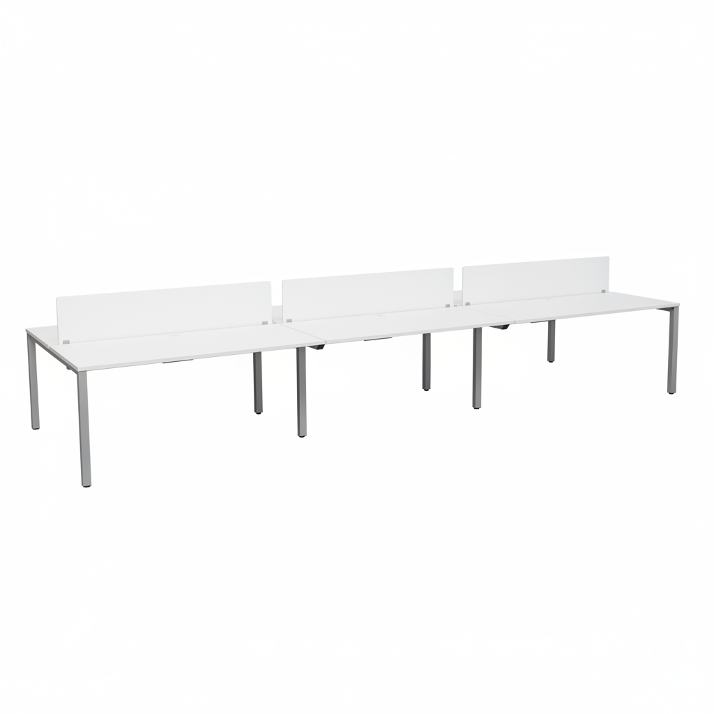 Esta mesa multipuesto es una solución amplia y eficiente para espacios de trabajo colaborativos, aportando orden, funcionalidad y una estética moderna. Su estructura incorpora patas metálicas en acabado gris, que garantizan estabilidad y resistencia incluso en usos intensivos.