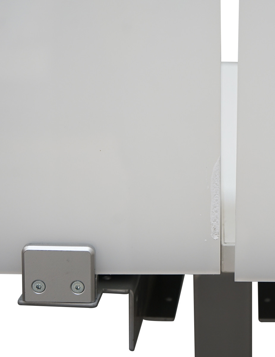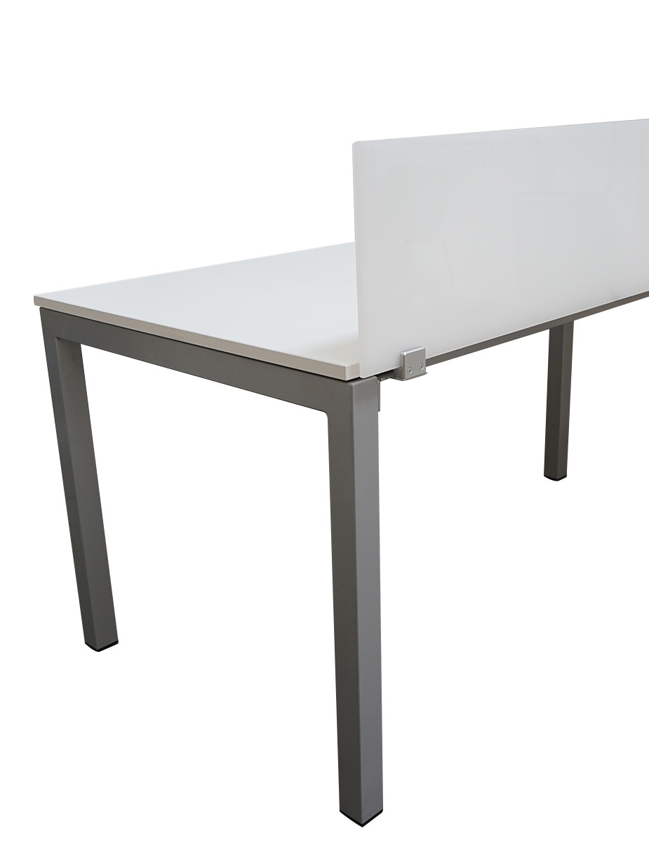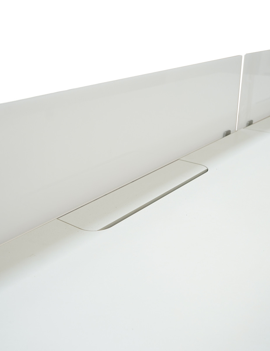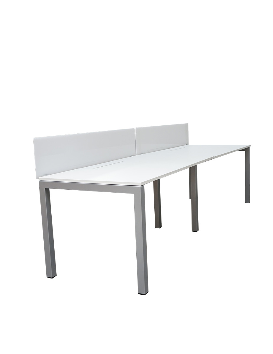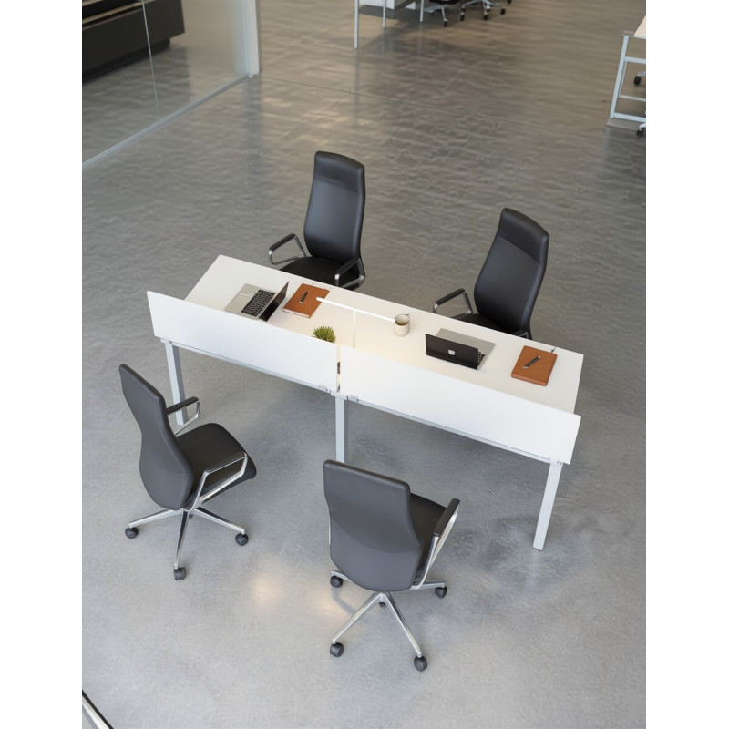 El tablero de melamina en acabado blanco ofrece una superficie amplia, luminosa y fácil de integrar en entornos modernos. Además, incorpora 2 divisorias de metacrilato en acabado blanco, ideales para delimitar puestos y aportar mayor privacidad visual entre usuarios sin recargar el espacio.