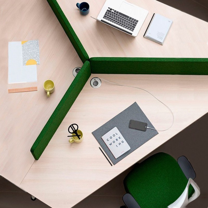 Twist Gen 100 incluye 3 pasacables circulares de color blanco, uno por cada puesto, y la opción de añadir 3 divisorias centrales tapizadas en tela, con la posibilidad de elegir su tapizado entre una amplia gama.