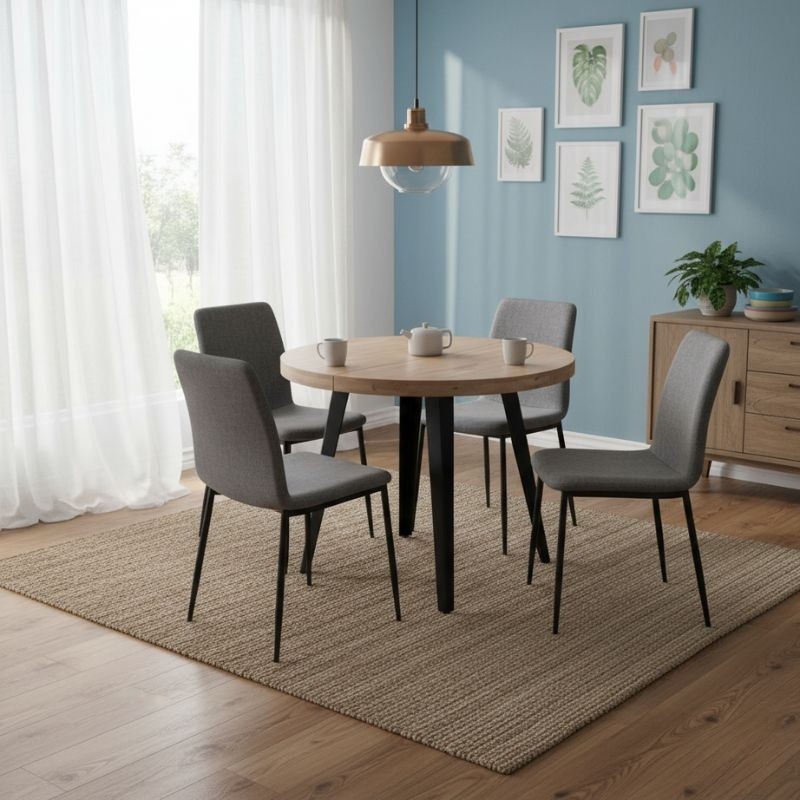 Su tapa extensible en madera de roble, con un grueso exterior de 54 mm, aporta calidez, resistencia y un acabado natural. Las patas metálicas en color negro contrastan con la madera, ofreciendo estabilidad y un estilo contemporáneo.