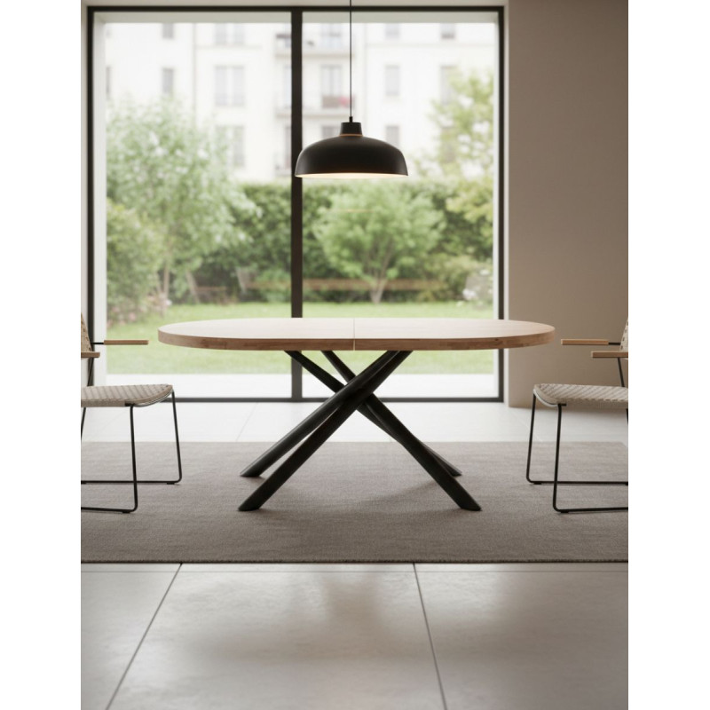 El tablero está fabricado en madera de roble, disponible en acabado Nordish o Honey, aportando calidez y carácter natural. Su forma ovalada suaviza las líneas del espacio y favorece la circulación alrededor de la mesa. La estructura y las patas metálicas en acabado negro garantizan estabilidad y un contraste contemporáneo que refuerza su presencia visual.