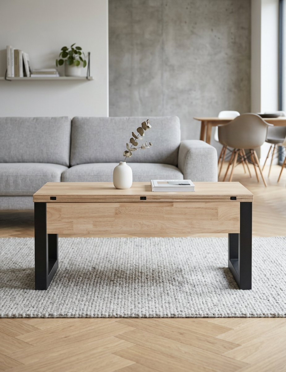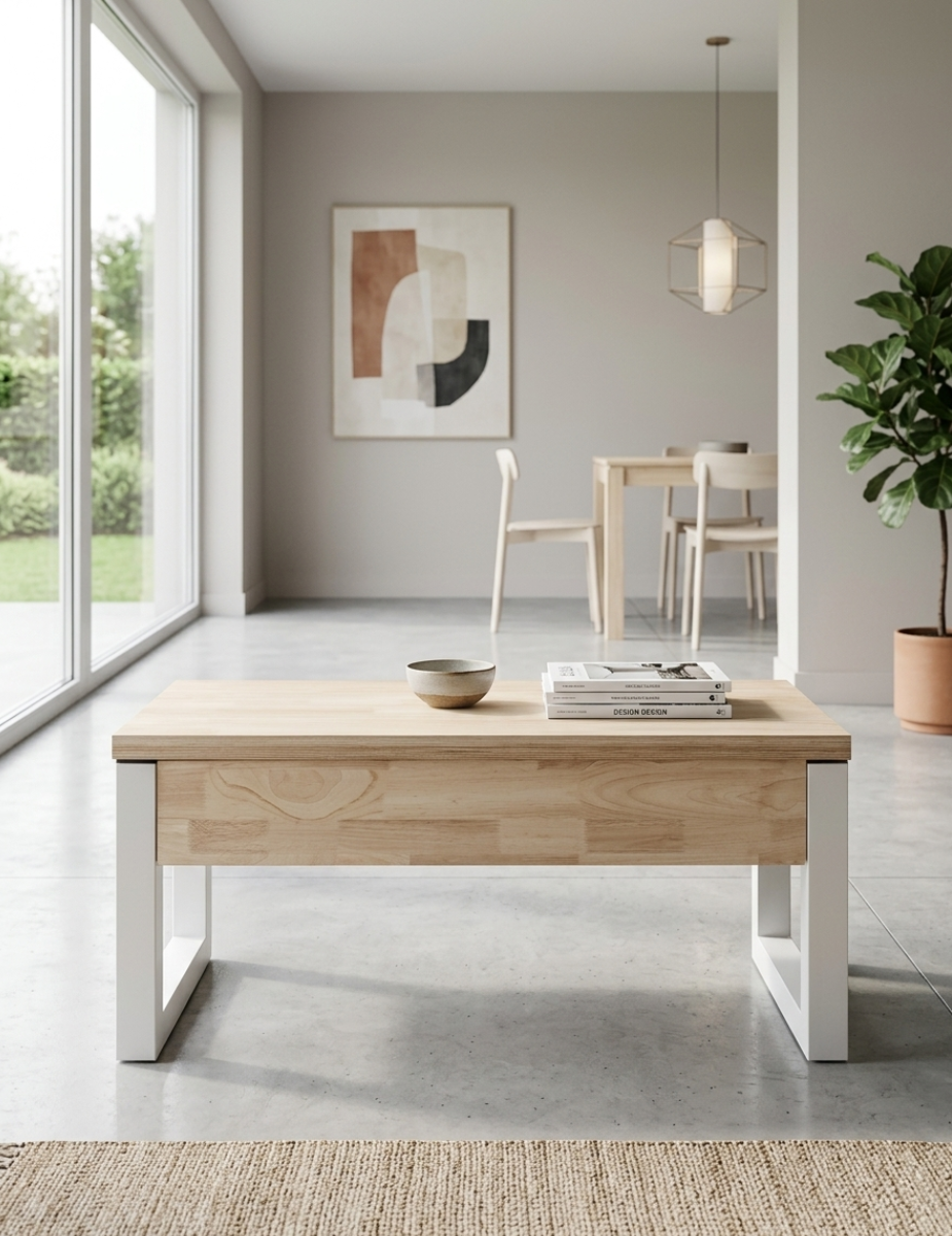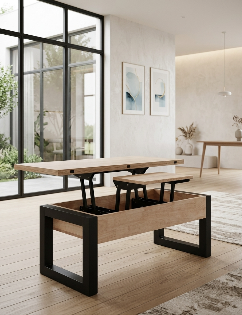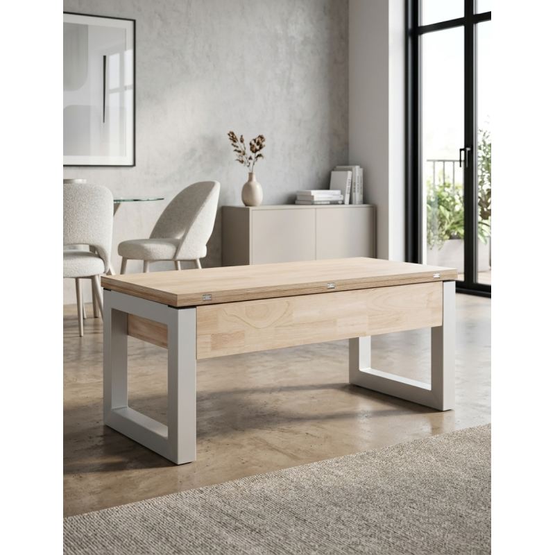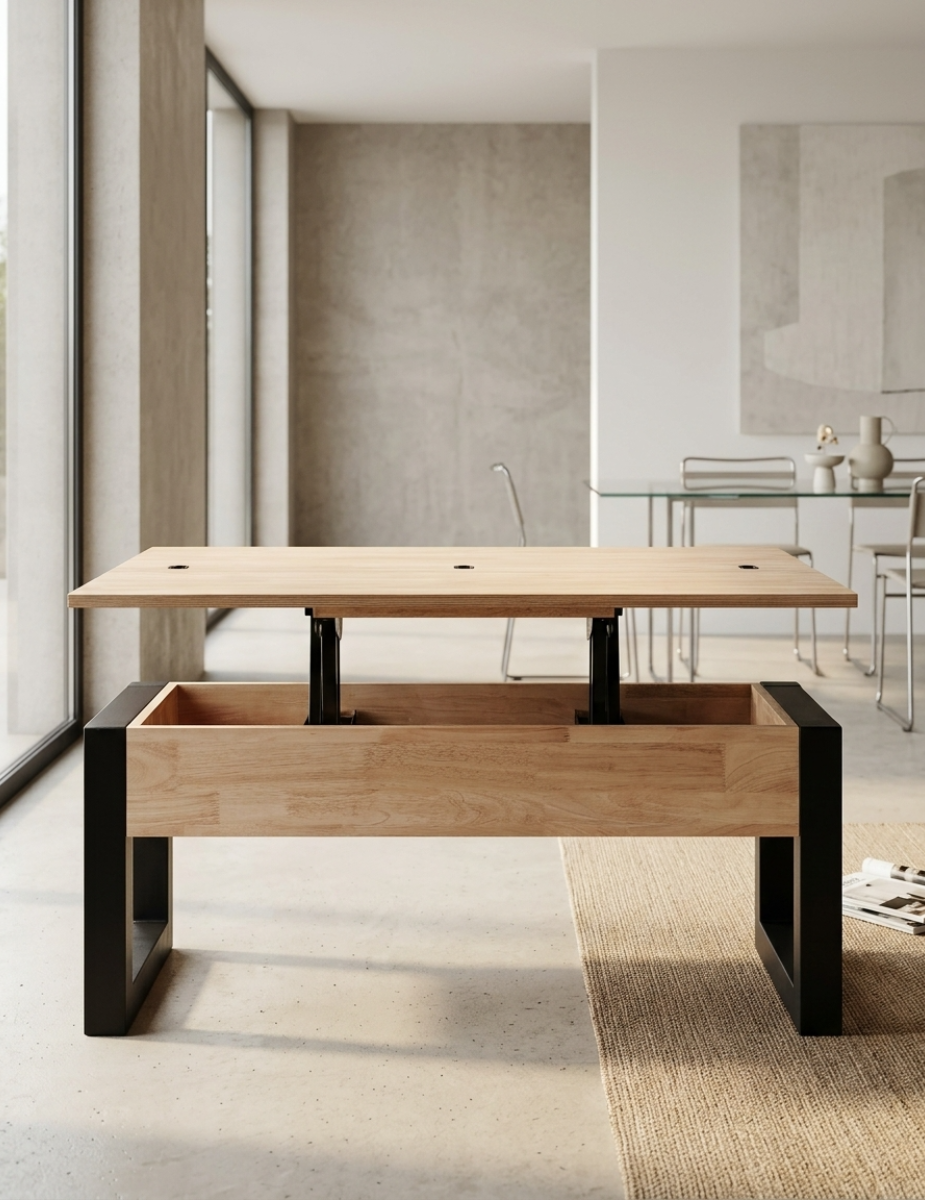 Incorpora un mecanismo de elevación y extensión robusto, pensado para un uso cómodo y duradero. Además, dispone de almacenamiento bajo la tapa, ideal para guardar objetos y mantener el espacio ordenado. Una mesa elevable y extensible diseñada para aportar practicidad sin renunciar al estilo.