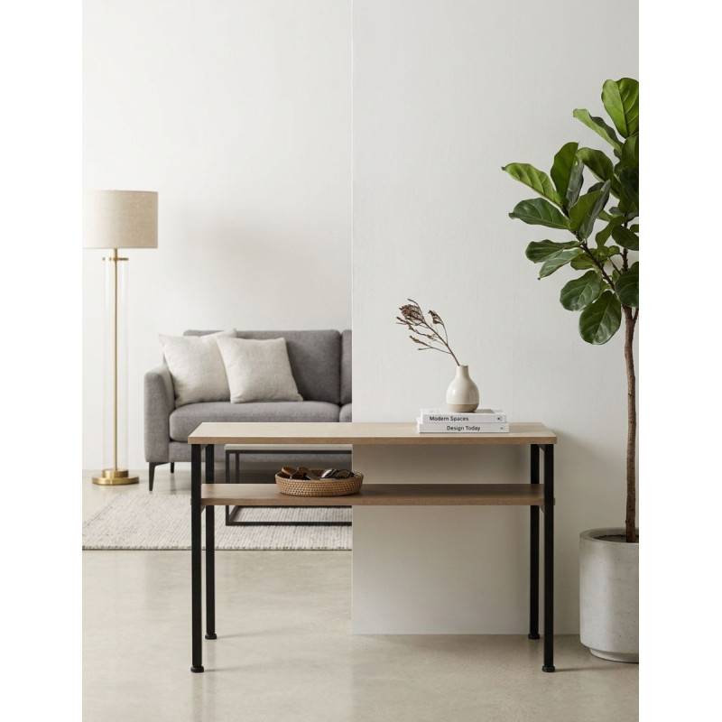 Cuentan con una estructura metálica en color negro, que aporta estabilidad, durabilidad y un toque industrial muy actual. El tablero de melamina en acabado roble ofrece una superficie práctica para el uso diario, mientras que el estante inferior también en roble permite organizar revistas, mandos u otros objetos, manteniendo el espacio ordenado.
