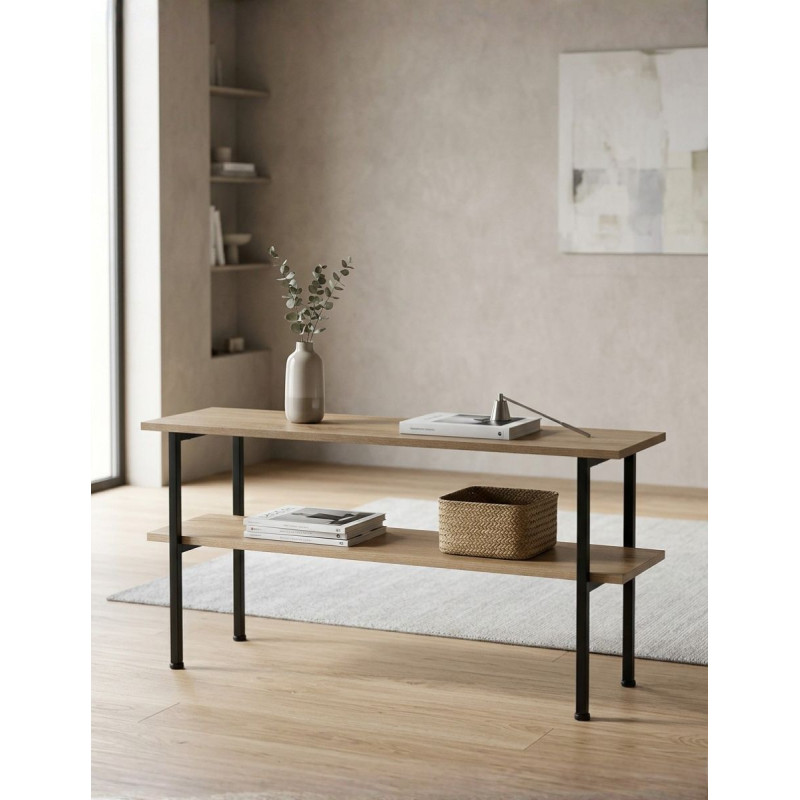 Cuentan con una estructura metálica en acabado negro, que aporta estabilidad, resistencia y un estilo industrial muy actual. El tablero de melamina en color roble ofrece una superficie amplia y práctica, mientras que el estante inferior también en roble permite organizar objetos, aportando orden y funcionalidad al conjunto.
