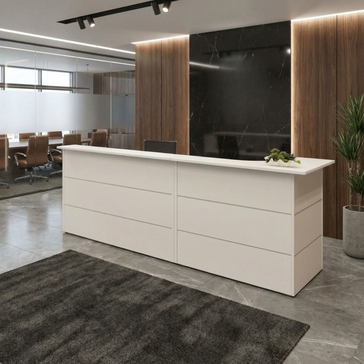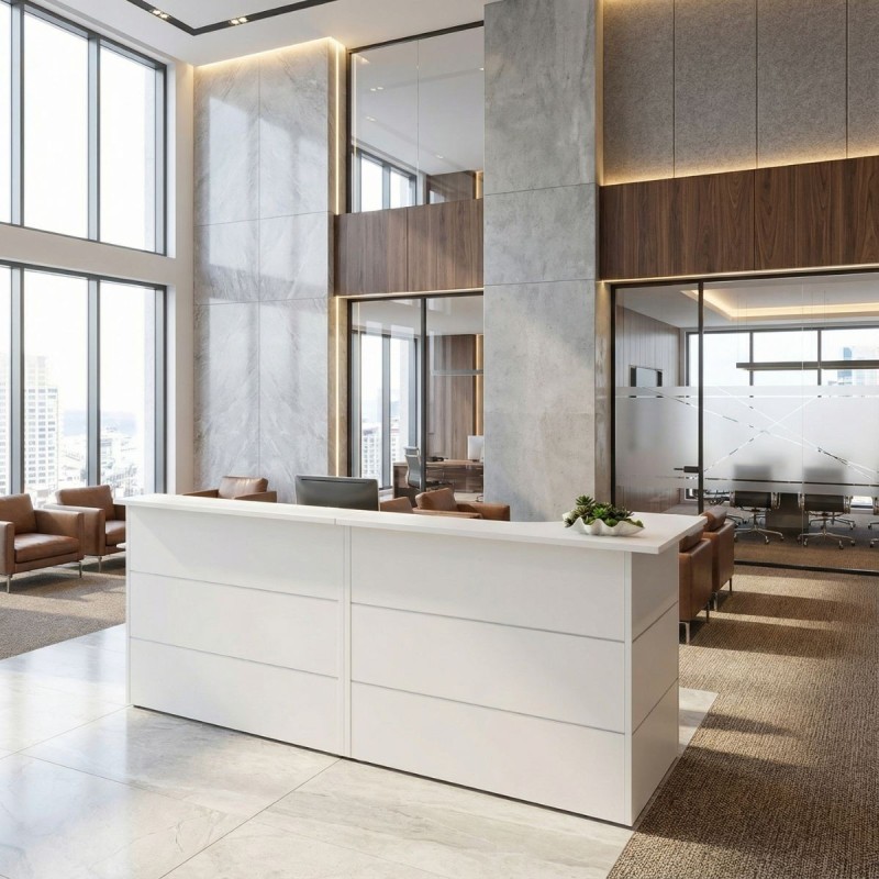 Un mostrador de recepción modular diseñado para quienes buscan versatilidad, orden y una imagen profesional adaptable a cualquier espacio.