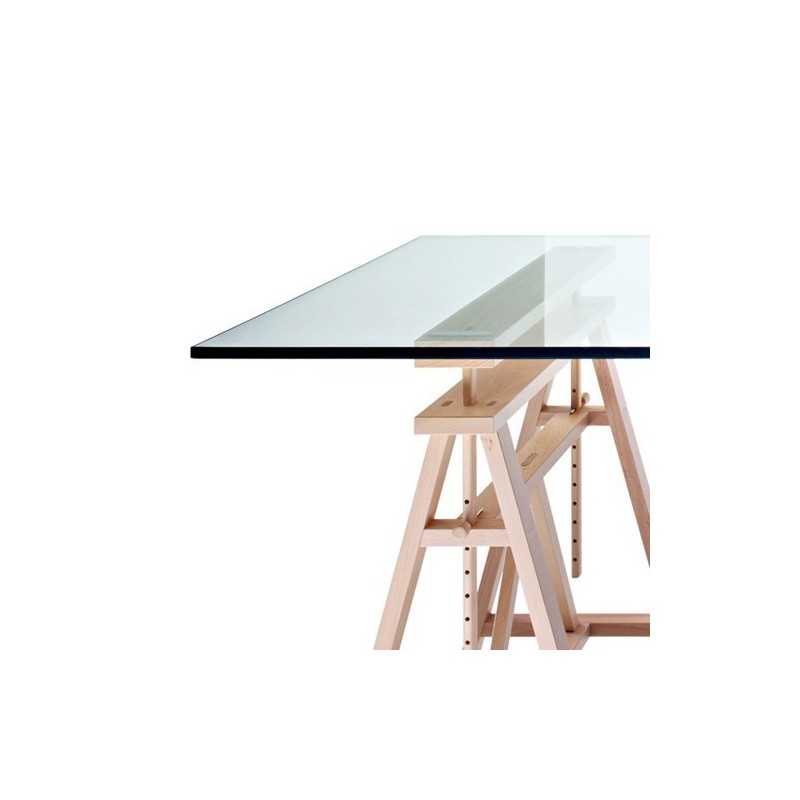 Es una mesa en madera maciza de haya con juego de caballetes regulables en altura.