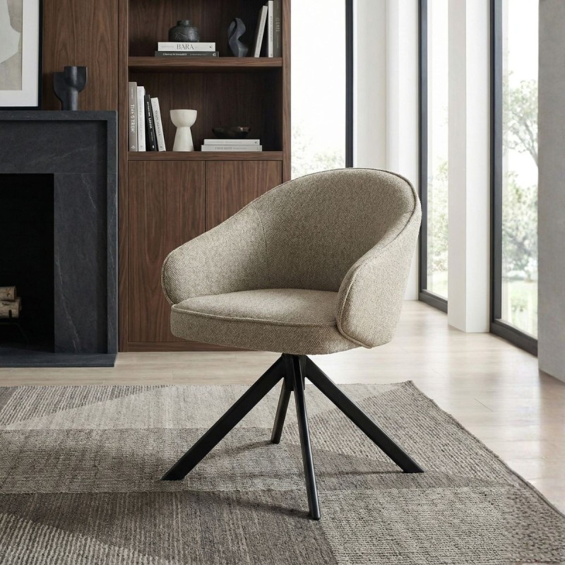 Las cuatro butacas Verona, con asiento y respaldo tapizados en tejido marrón 12 Lukka, ofrecen un confort envolvente gracias a su giro de 360º y su base araña metálica negra, que añade un toque moderno y sofisticado.