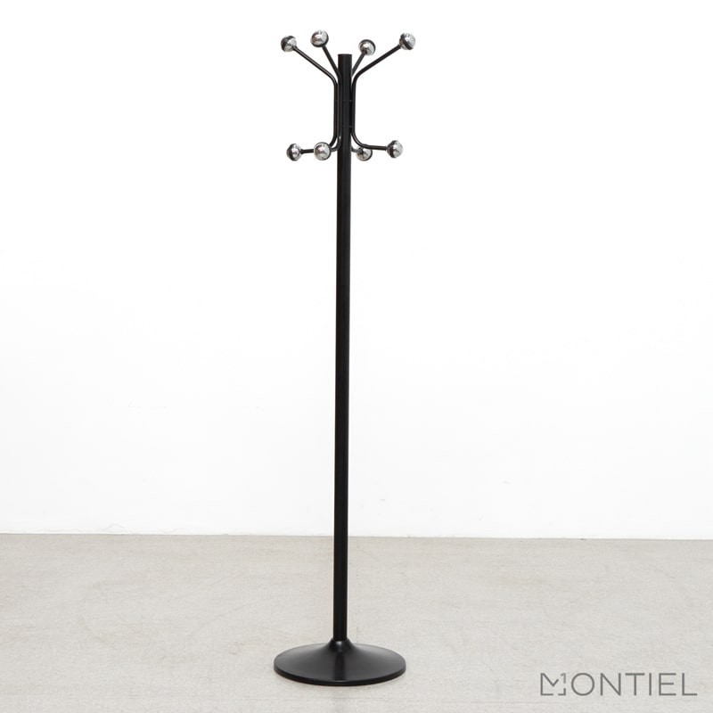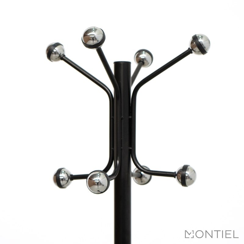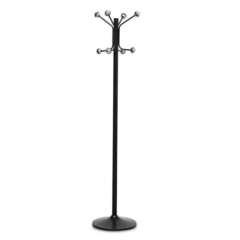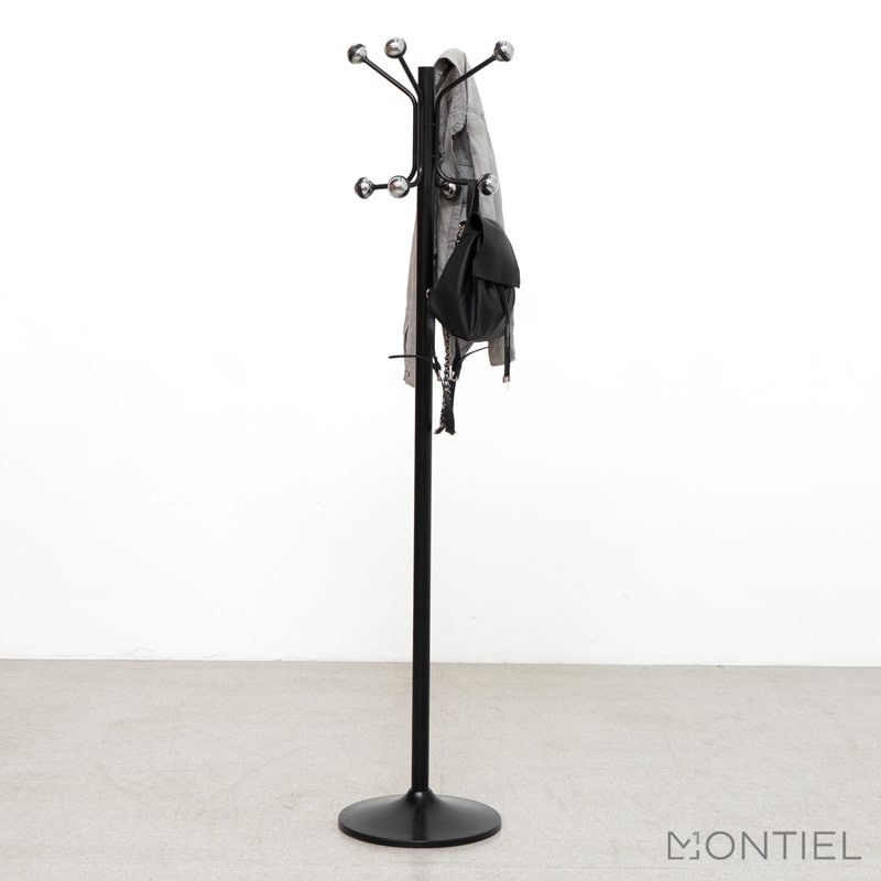 Este perchero de pie está fabricado de metal en acabado negro, con 8 colgadores los cuales terminan en forma de bola de acabado cromado.