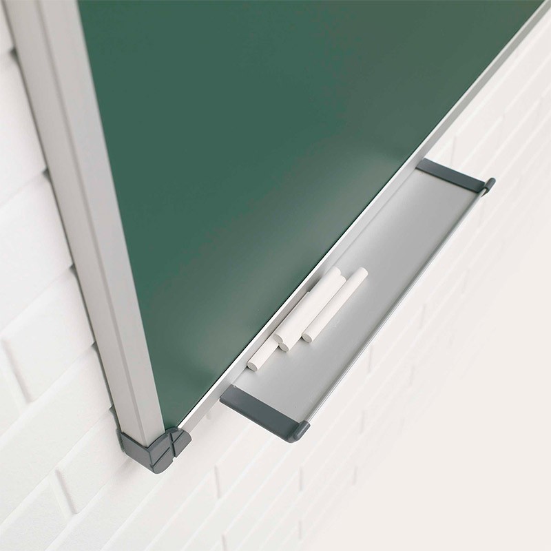 Su superficie de color verde es magnética de acero vitrificado, para la escritura con tiza. Además, para poder apoyar a ésta, incluye un cajetín en la parte inferior.
