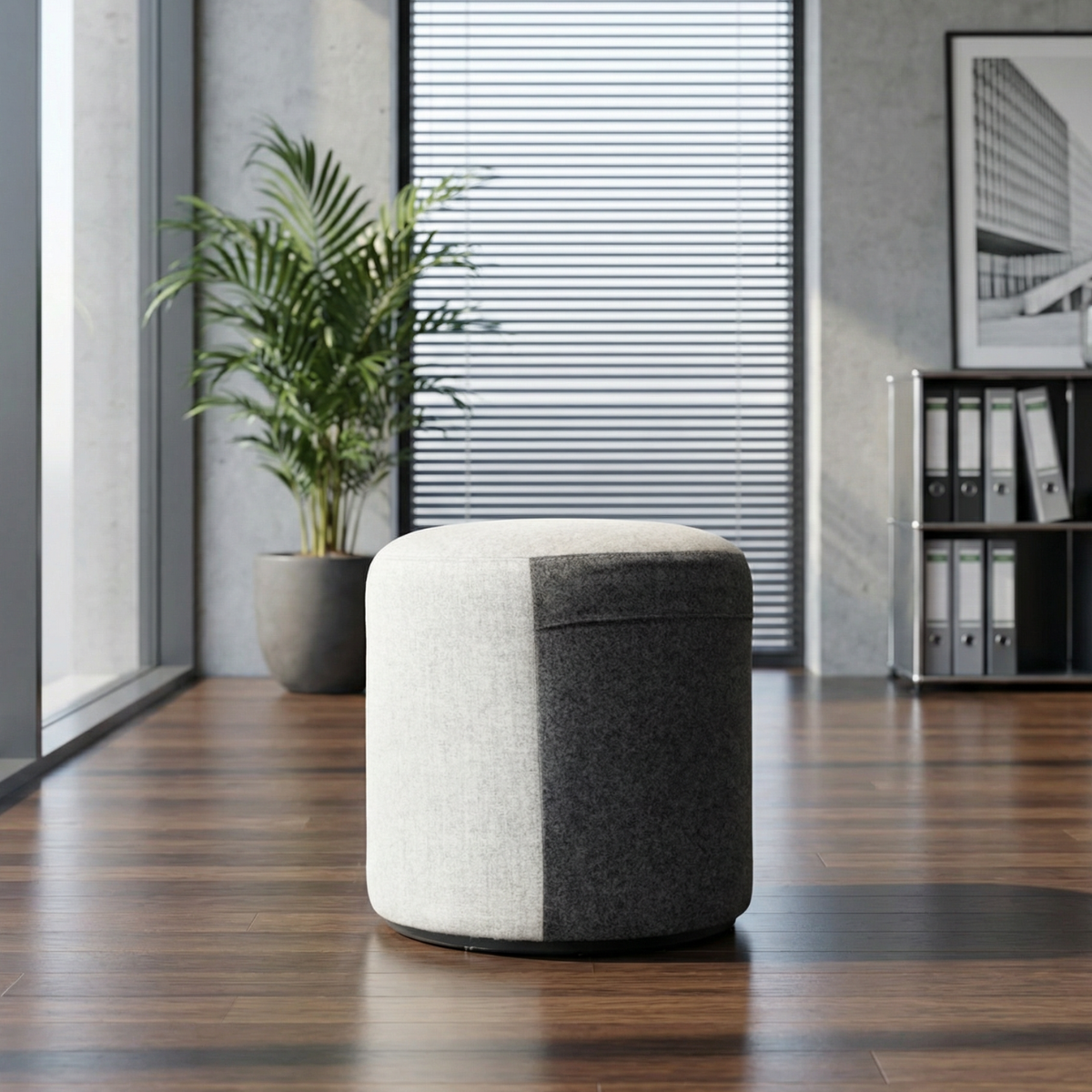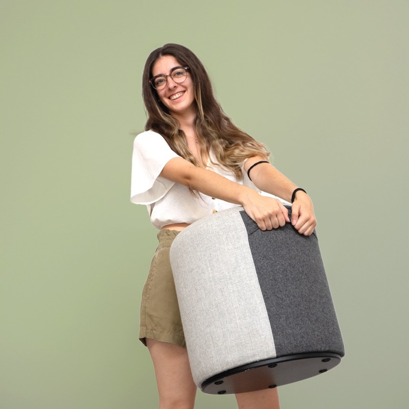 El asiento puf redondo Cyl de forma 5 con tapizado en tela gris y gris oscuro es una pieza de mobiliario versátil y moderna que se adapta perfectamente a diferentes espacios. Su diseño redondeado y compacto le brinda una apariencia elegante y contemporánea, ideal para salas de espera, recepciones y zonas contract.