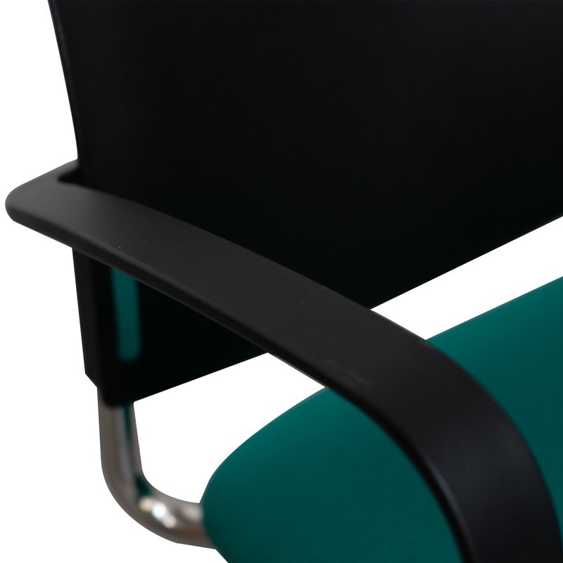 El asiento tapizado, disponible en tela o símil piel con acabado personalizable, permite adaptar el diseño al estilo de cada entorno. Los brazos fijos proporcionan un apoyo cómodo y favorecen una postura adecuada durante la conversación o el trabajo puntual.