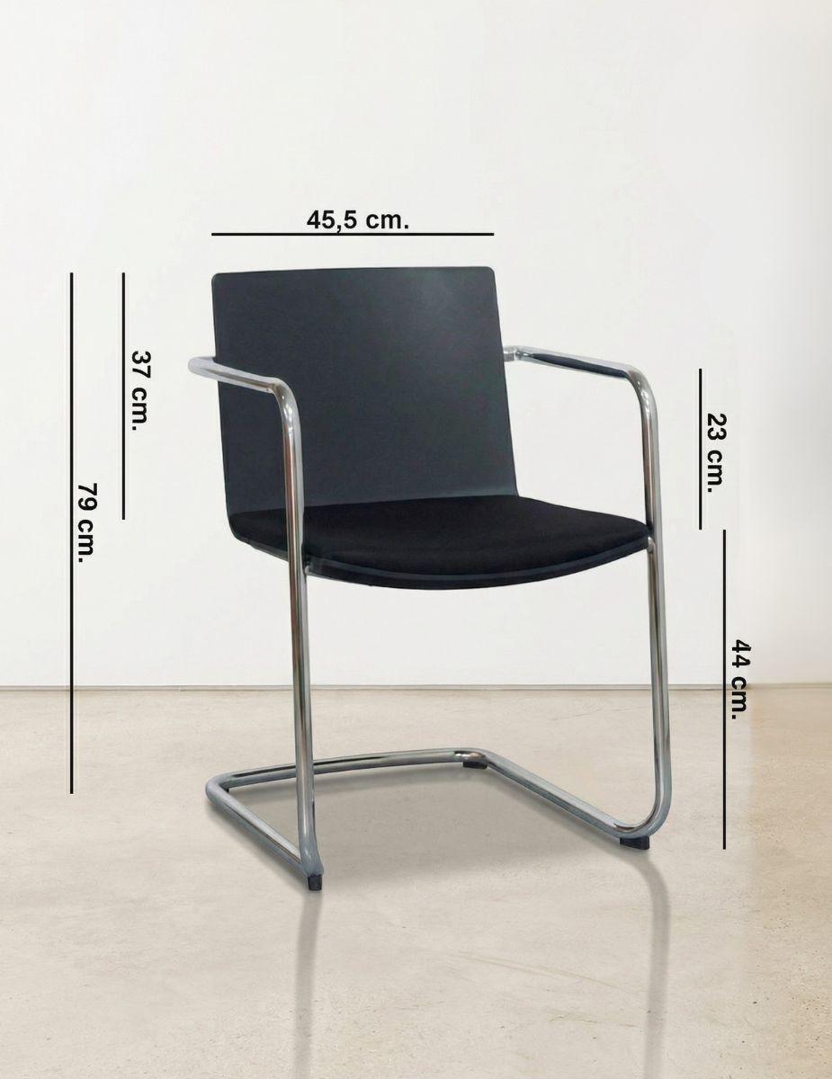 La Silla Oficina Confidente Cromada de Wilkhahn es una pieza diseñada para aportar elegancia y profesionalidad a salas de reuniones, despachos y espacios de atención. Con unas dimensiones totales de 79 cm de alto, 55 cm de ancho y 46 cm de fondo, ofrece proporciones equilibradas y una presencia ligera pero sofisticada.