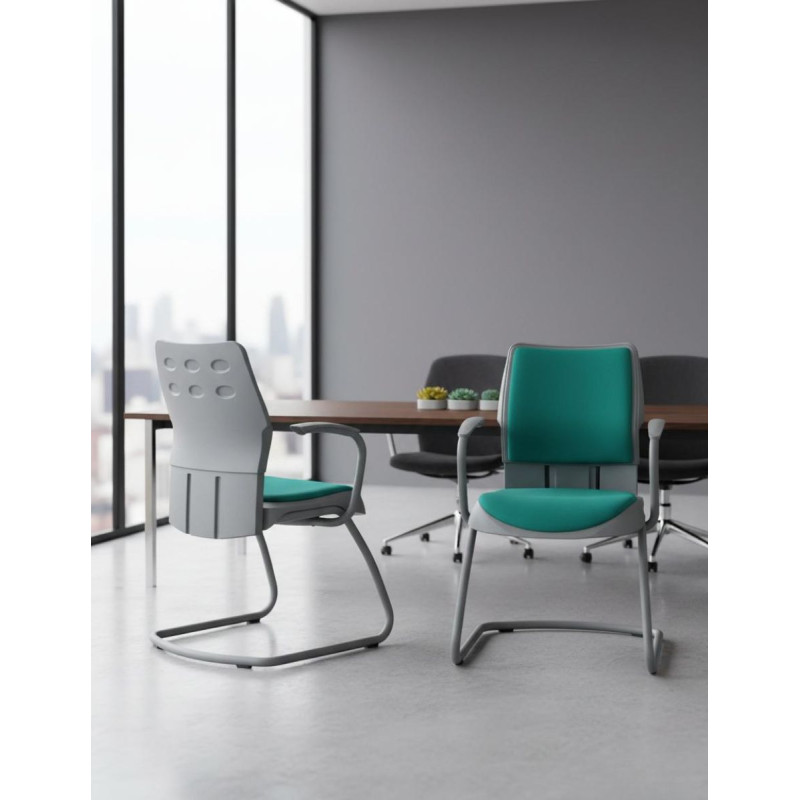 La silla de visitas Swift de Steelcase, está tapizada en tela o símil piel de acabado personalizable. La carcasa del respaldo está fabricada en poliamida color gris.