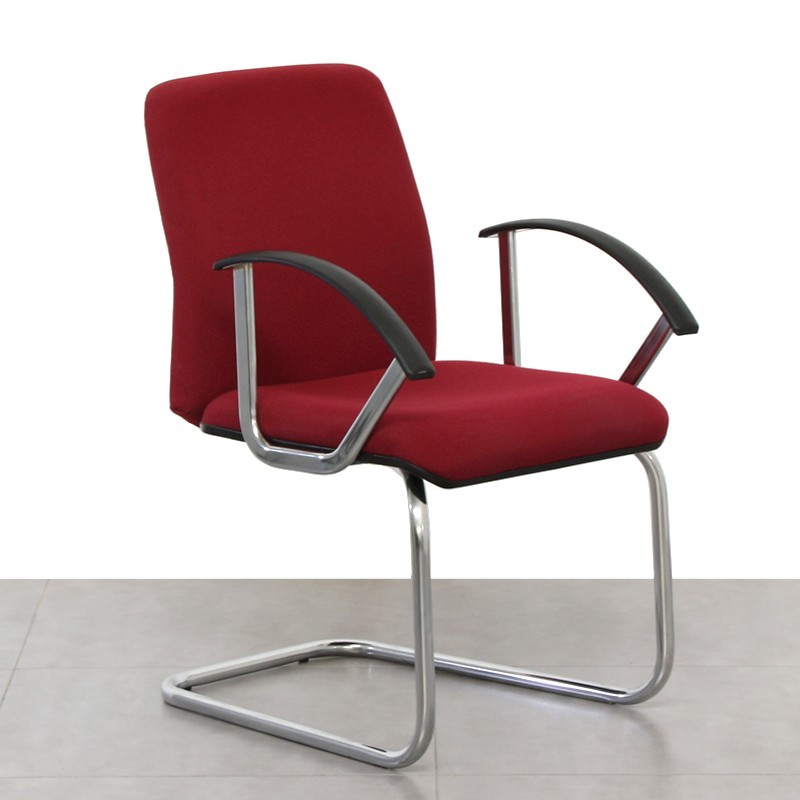 La Silla de Confidente de De La Oliva está tapizada en tela color granate (con posibilidad de elegir otro color de tapizado), y brazos en aluminio pulido y poliamida negra.