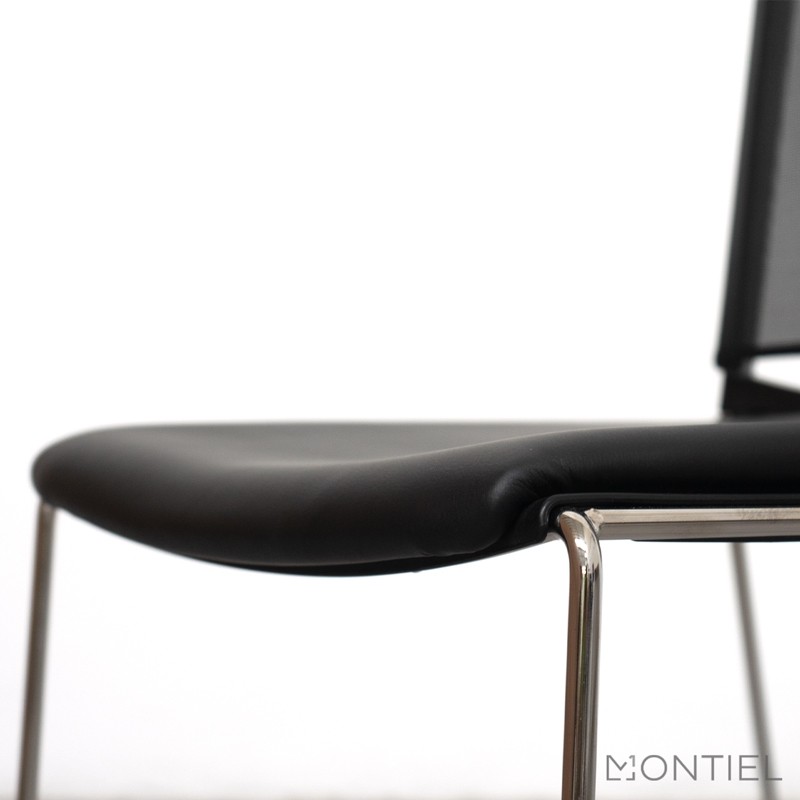 El asiento está tapizado en símil piel negra, proporcionando un aspecto elegante y fácil de limpiar. El tapizado de símil piel también añade un toque de sofisticación a la silla, siendo una opción práctica y duradera.