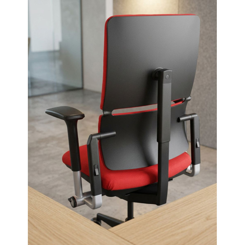 Los brazos 3D de polipropileno negro (14–24 cm de alto) facilitan un apoyo preciso en múltiples direcciones. El asiento y respaldo están tapizados en tela personalizable, mientras que la base giratoria metálica negra y la carcasa trasera en polipropileno negro refuerzan su carácter profesional y duradero.