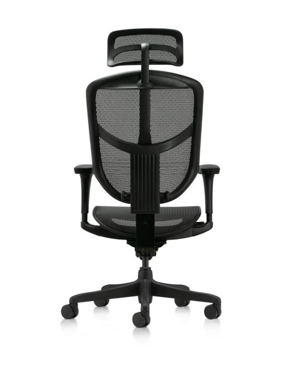 El asiento regulable en altura (44,5–53,5 cm) y el respaldo de malla negra transpirable favorecen la ventilación y el confort continuo. Incorpora cabezal oscilante y regulable en altura en malla negra, aportando apoyo cervical ajustado a cada usuario. El respaldo es además regulable en altura y en tensión lumbar, permitiendo personalizar el soporte en la zona baja de la espalda.