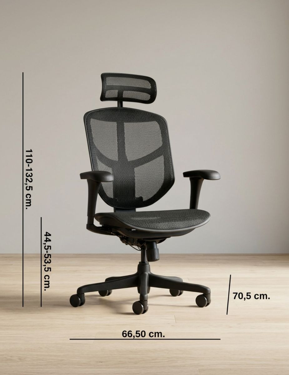 La Silla Oficina Ergonómica Malla Negra EJ25 de Herpesa está diseñada para ofrecer soporte avanzado y máxima adaptabilidad en jornadas intensivas. Con unas dimensiones totales de 110 a 132,5 cm de alto, 66,5 cm de ancho y 70,5 cm de fondo, proporciona una estructura envolvente que acompaña el movimiento natural del cuerpo.