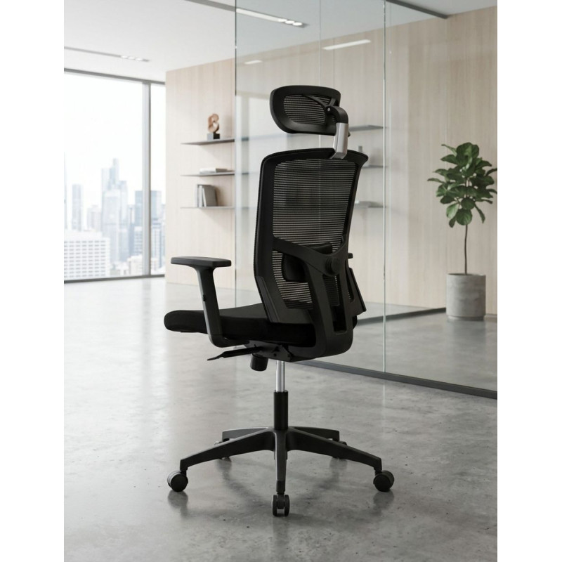Para un mayor confort, el respaldo incluye un cabezal tapizado en la misma malla.