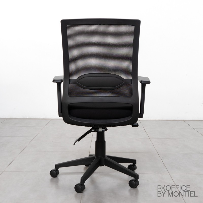 El asiento está fabricado con madera contrachapada con un relleno de goma flexible de alta densidad. El acabado de su tapizado es en tela flex de color negro. Su respaldo esta tapizado en malla (red) con un efecto tela de alta resistencia, consigue que se integre perfectamente en la oficina o entorno de trabajo.