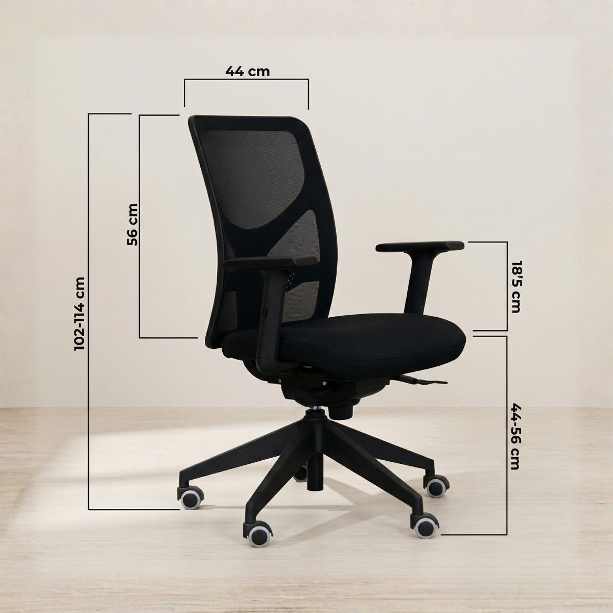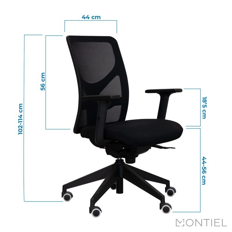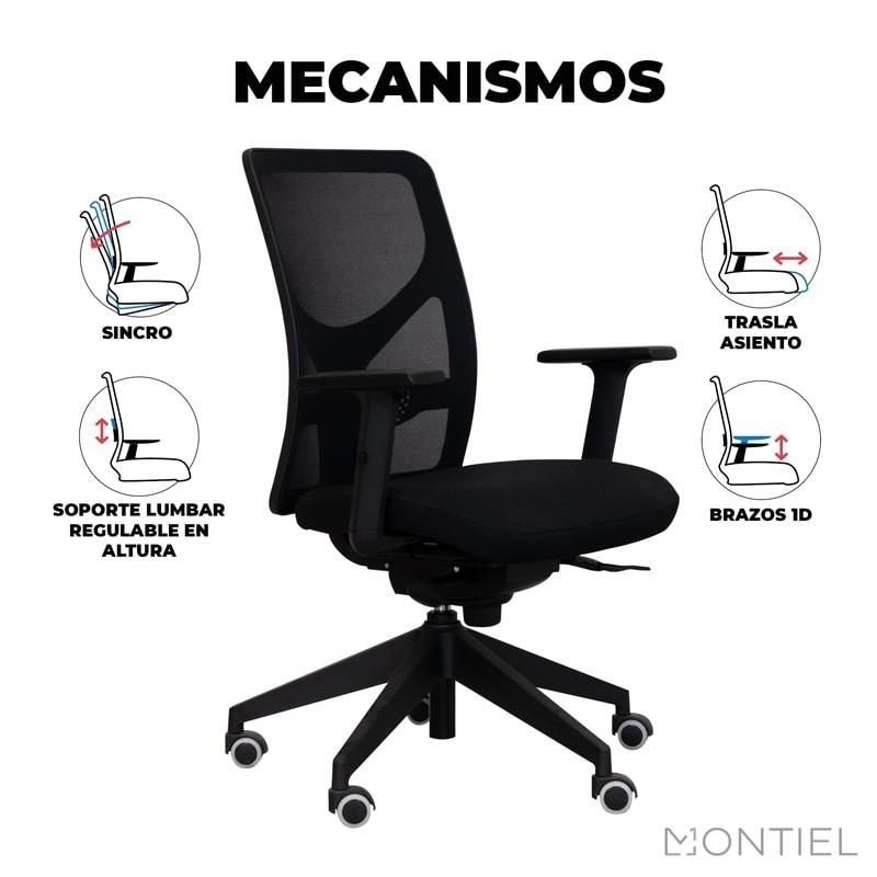 De gran adaptabilidad, gracias a su sistema sincro y su sistema de elevación a gas, lumbar regulable, esta silla operativa incluye reposabrazos regulables en altura acolchados, fabricados en poliamida color negro.
