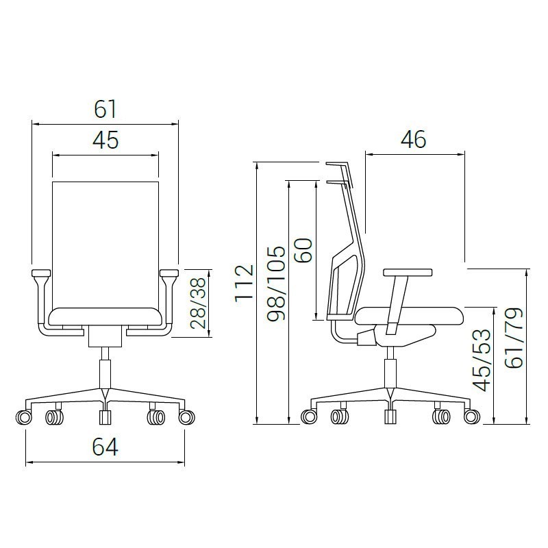 Sus brazos son de polipropileno negro con reposabrazos de poliuretano del mismo color, y son regulables en altura (1D).