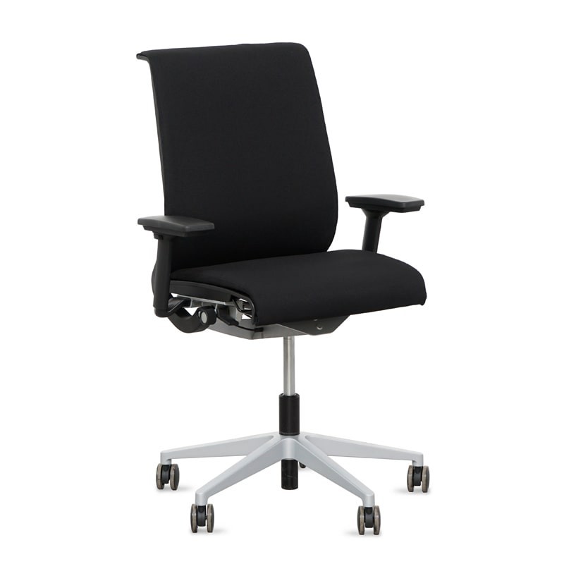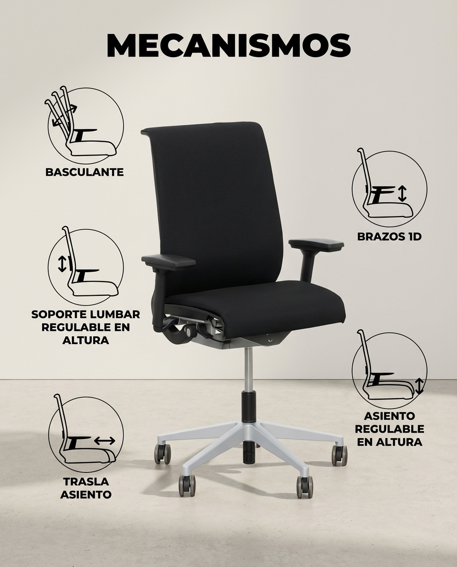 El asiento ha sido tapizado en tela de alta calidad con posibilidad de color a elegir. Los brazos en color negro son regulables en altura. El mecanismo basculante, pistón de altura y desplazamiento en profundidad del asiento permiten regular la silla Think de Steelcase adaptándola a cualquier usuario. Su base de 5 radios en color negro, está fabricada en acero.
