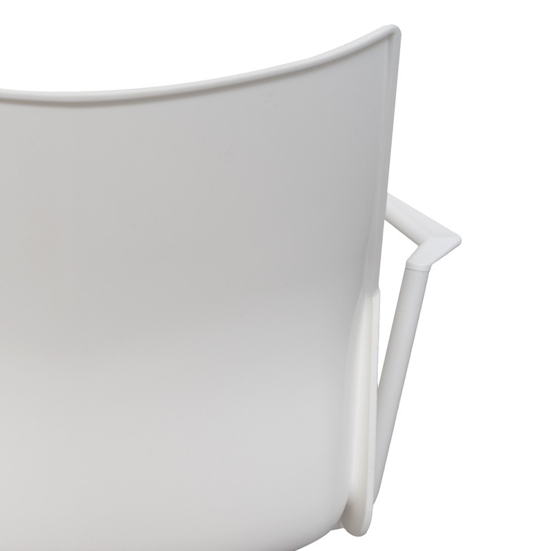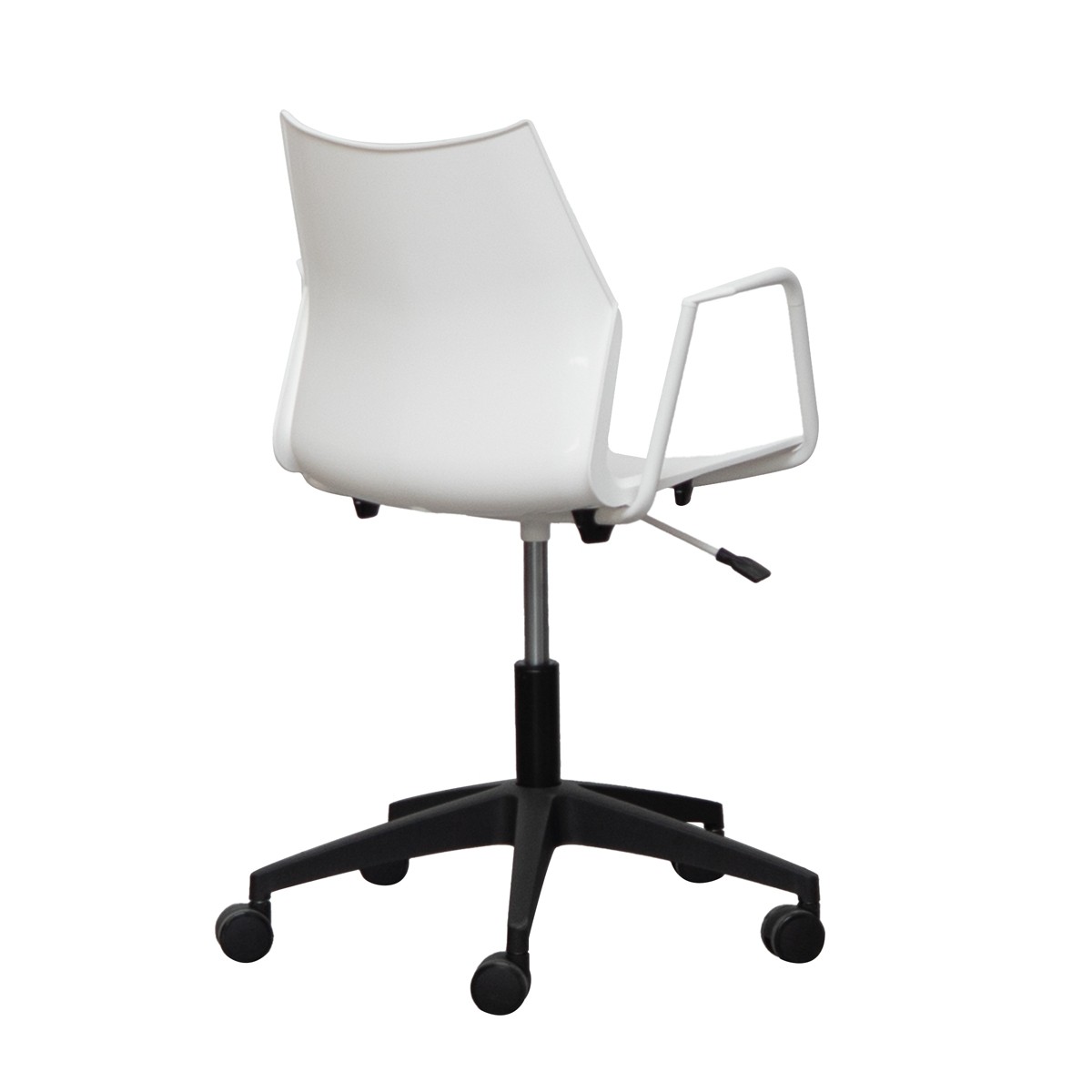 Su construcción integra una base giratoria de polipropileno en acabado negro, resistente y fácil de mantener, combinada con una monocarcasa de polipropileno en acabado blanco, que aporta un estilo limpio, actual y muy versátil. Los brazos fijos en acabado blanco complementan el diseño, ofreciendo un apoyo adicional y manteniendo una estética uniforme.