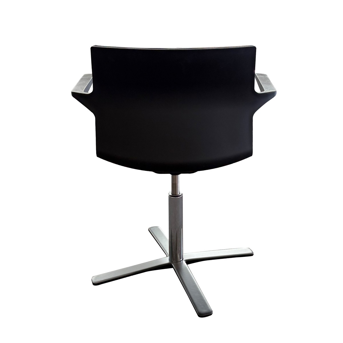 Su estructura cuenta con una base de 4 radios metálicos en acabado cromado, que proporciona estabilidad y un estilo moderno. La carcasa de polipropileno en negro, junto con el asiento y respaldo delantero tapizados en símil piel, aporta durabilidad, fácil limpieza y una estética profesional. Los brazos fijos de polipropileno complementan la ergonomía del modelo.