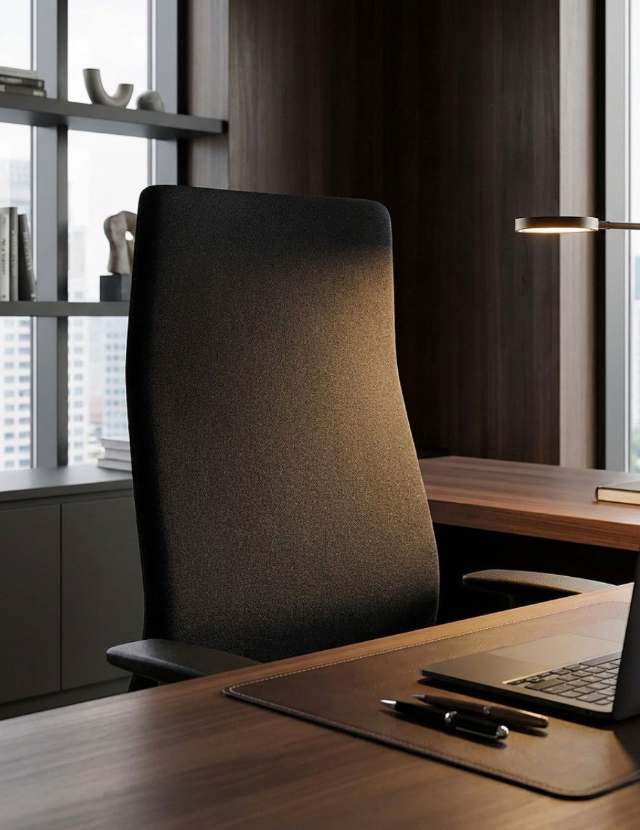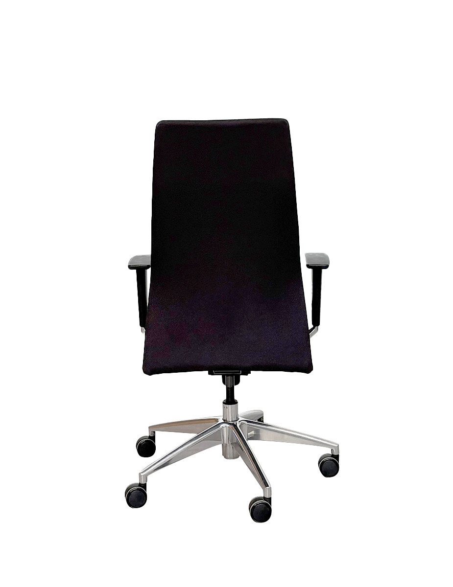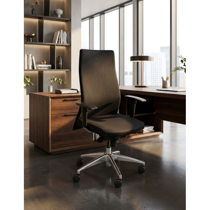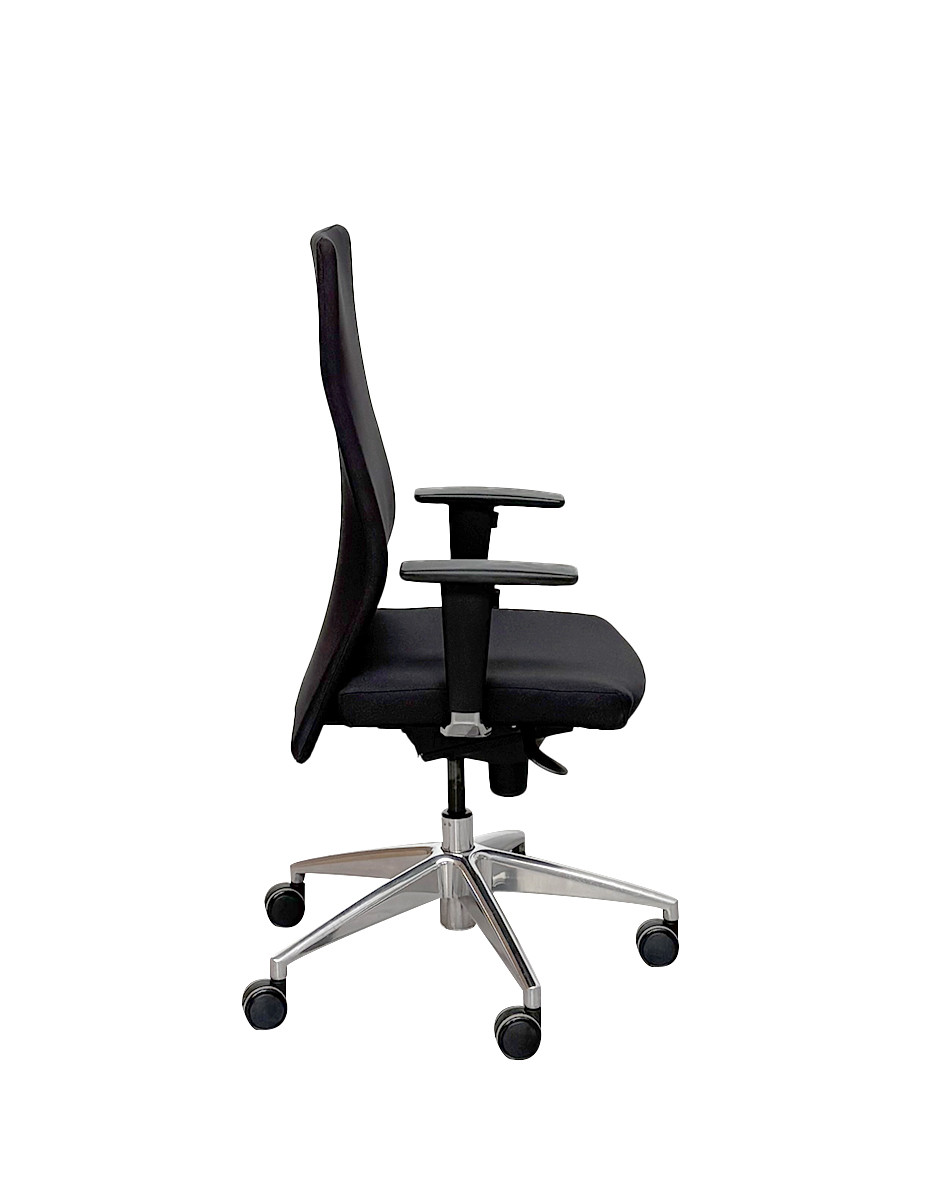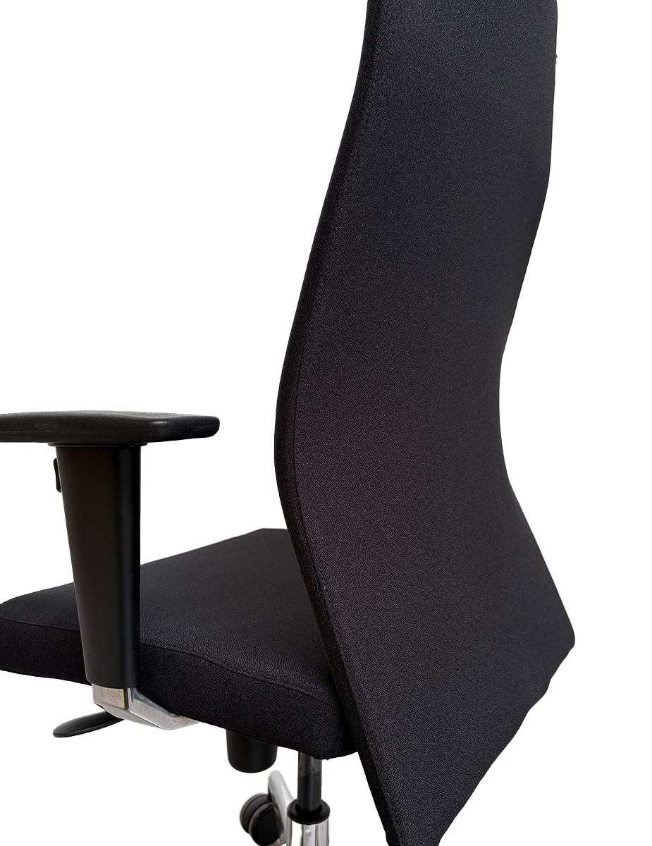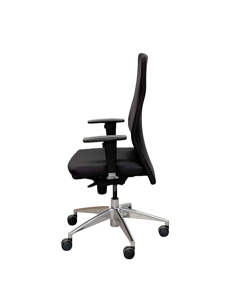 El asiento y respaldo tapizados en tela de acabado negro ofrecen una estética sobria, versátil y fácil de integrar en cualquier entorno de oficina. Además, cuenta con brazos 3D de polipropileno negro, diseñados para mejorar el apoyo y favorecer una postura más cómoda durante la jornada.