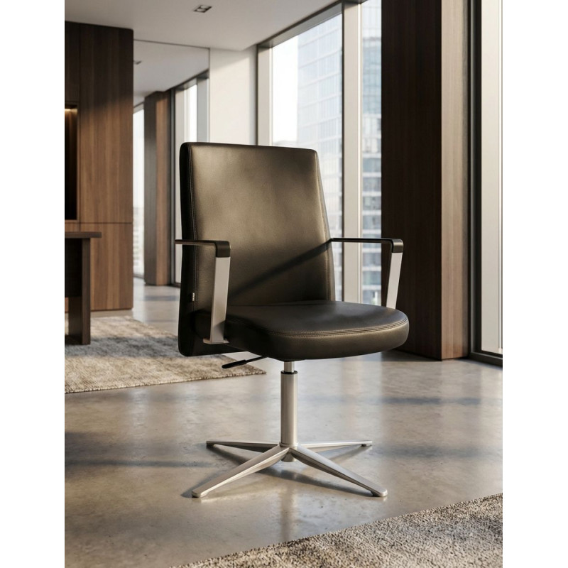 Esta silla de oficina giratoria combina elegancia, comodidad y funcionalidad para despachos, salas de reuniones o espacios de dirección que buscan una imagen cuidada y profesional. Su base de 4 radios de aluminio aluminizado aporta estabilidad, resistencia y un acabado moderno que realza el diseño del conjunto.