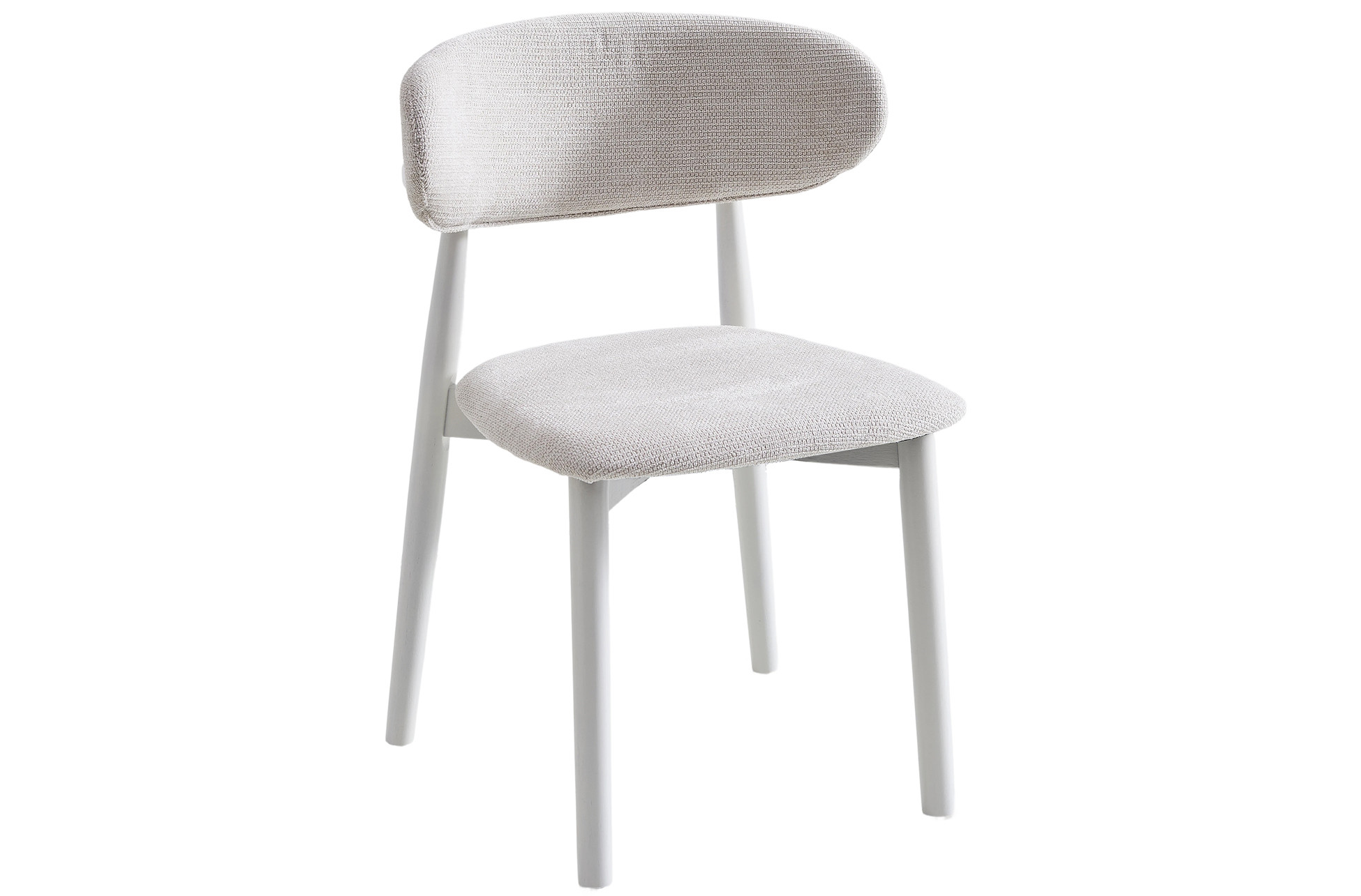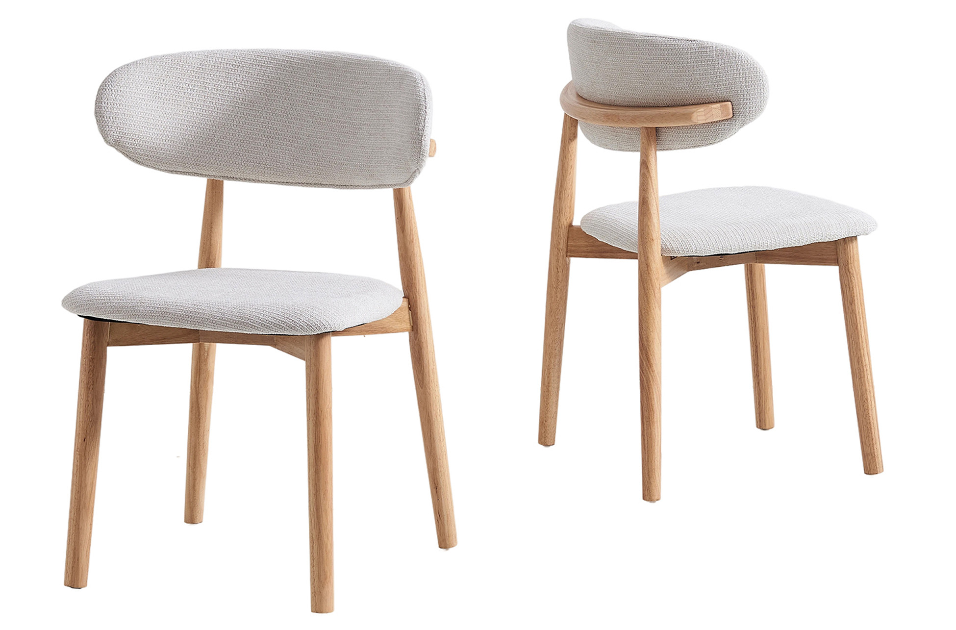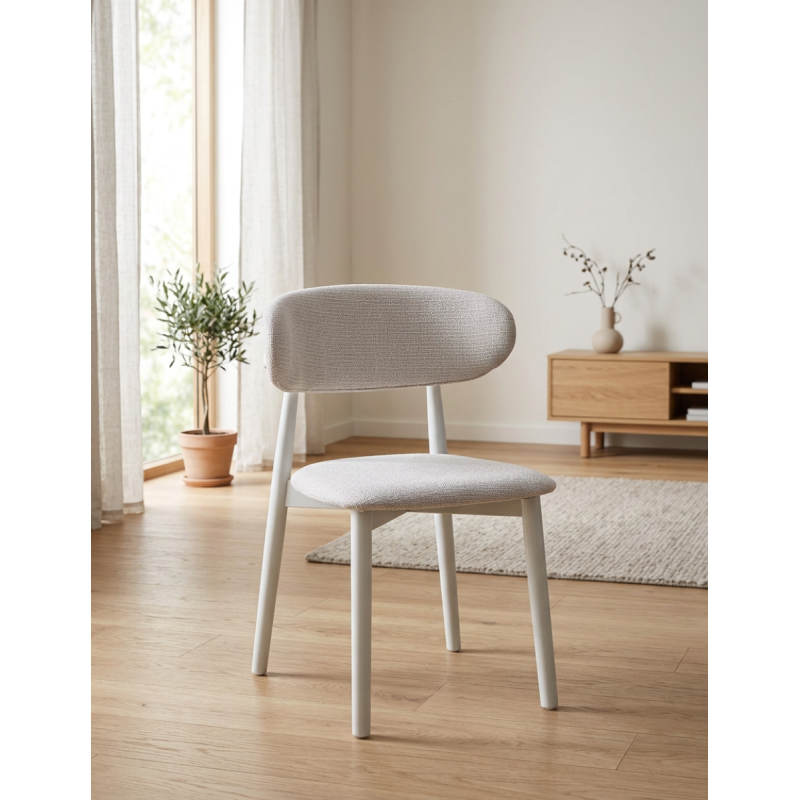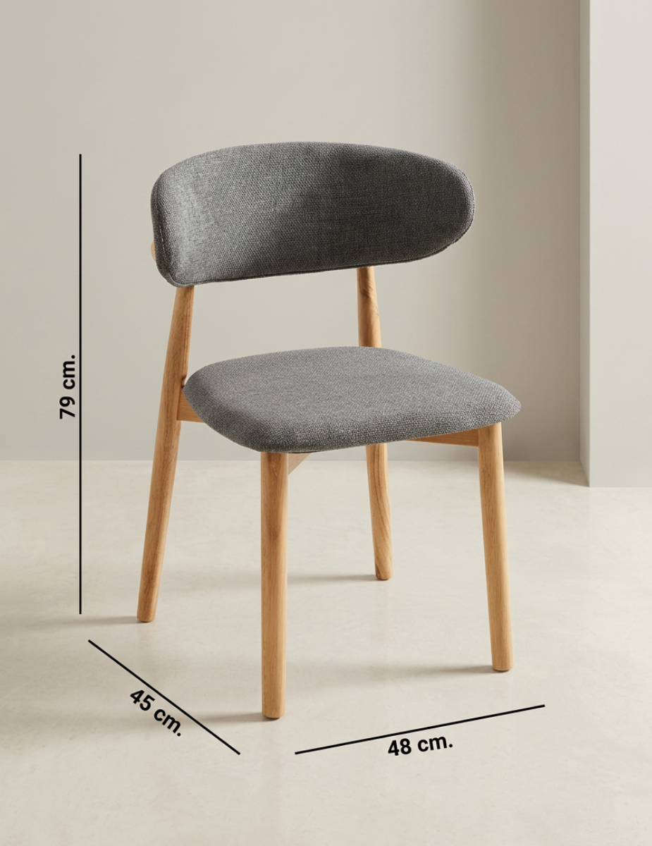 Cuenta con una estructura fija ensamblada en madera maciza, que aporta estabilidad, resistencia y un toque natural muy elegante. El asiento y respaldo tapizados en tela, disponibles en acabados beige, gris, gris y blanco o beige y blanco, ofrecen una sentada cómoda y adaptable a distintos estilos decorativos.
