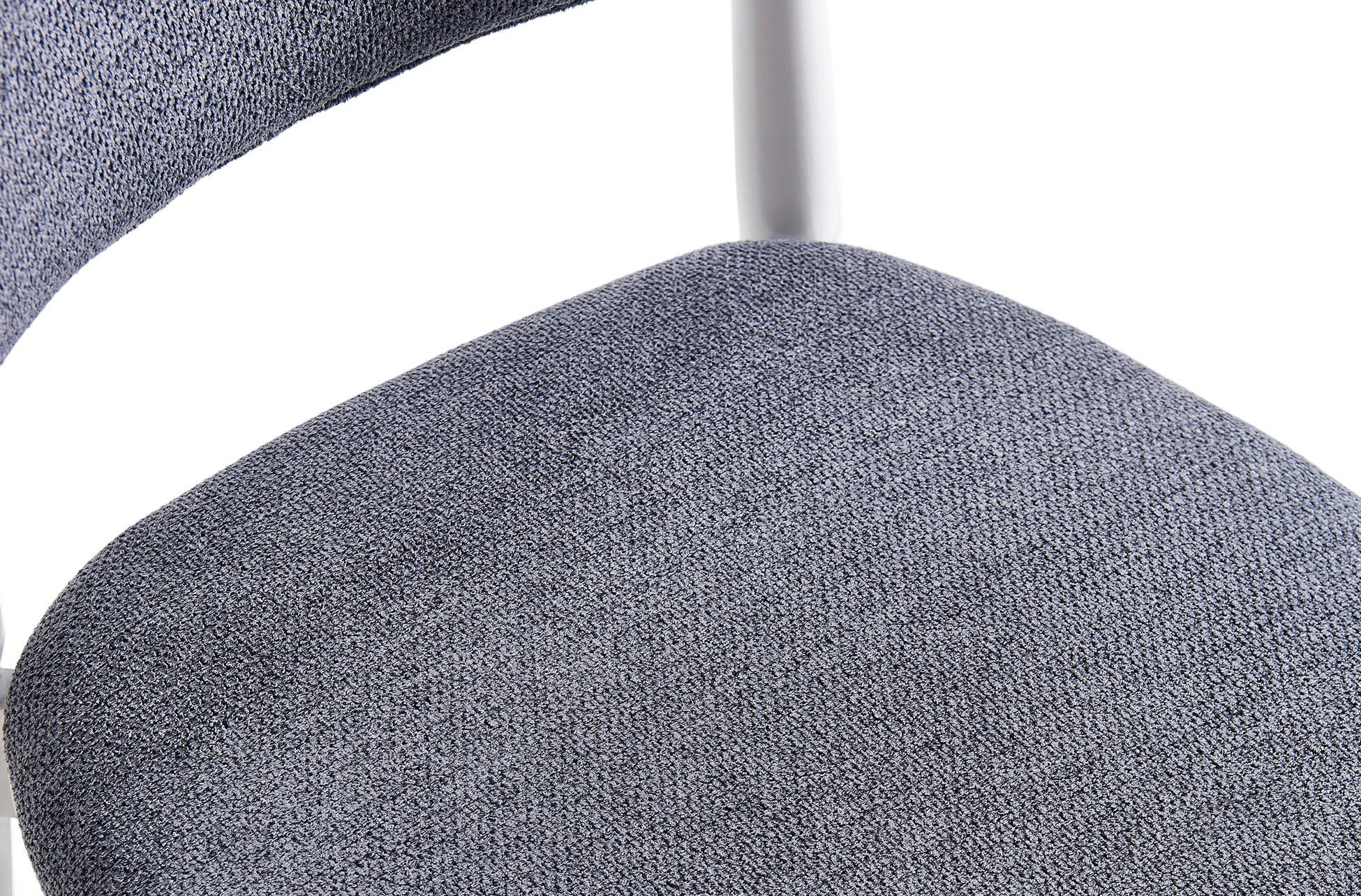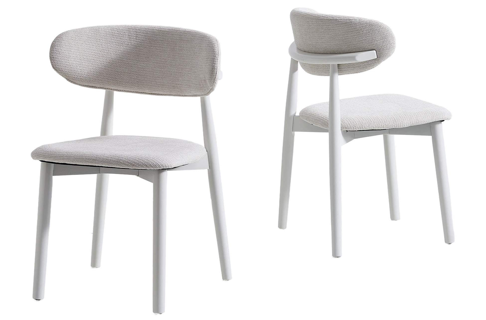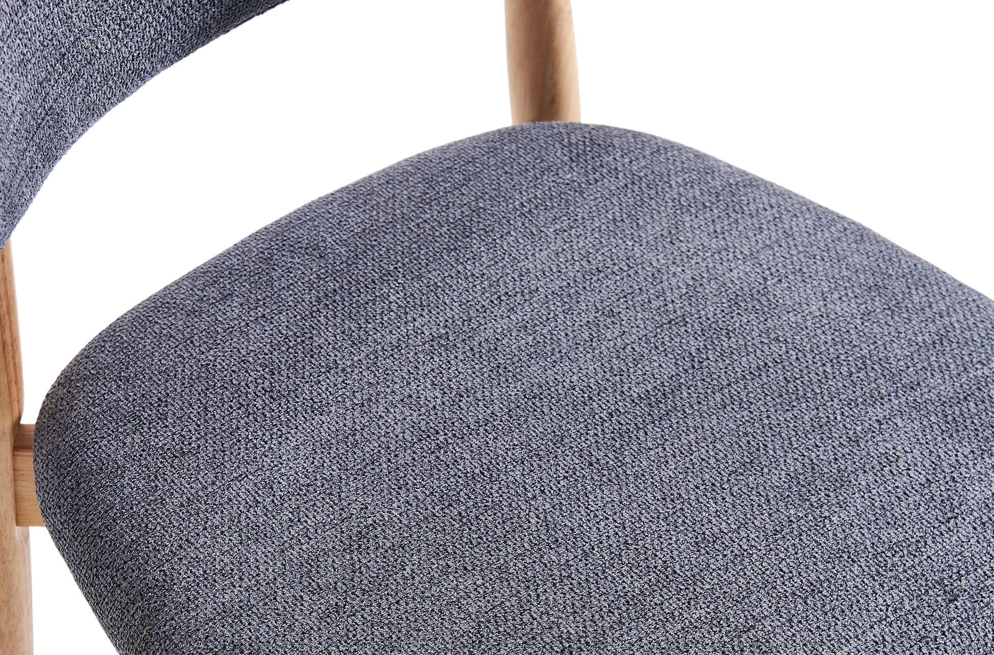 Cuenta con una estructura fija ensamblada en madera maciza, que aporta estabilidad, resistencia y un toque natural muy elegante. El asiento y respaldo tapizados en tela, disponibles en acabados beige, gris, gris y blanco o beige y blanco, ofrecen una sentada cómoda y adaptable a distintos estilos decorativos.