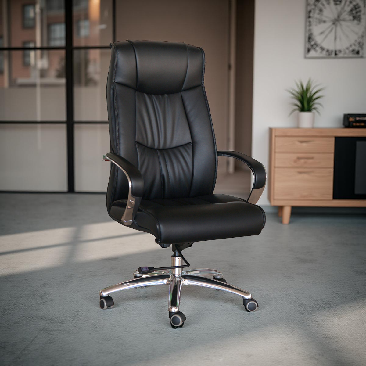Su estructura incorpora una base giratoria de aluminio pulido, que aporta resistencia, estabilidad y un acabado premium. El asiento y respaldo tapizados en símil piel o piel, disponibles en acabado personalizable, permiten adaptar el sillón al estilo del despacho.