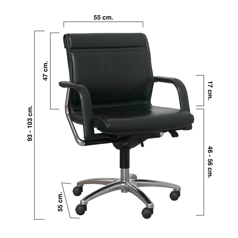 Con unas dimensiones de 93 a 103 cm de alto, 67 cm de ancho y 55 cm de fondo, este sillón ofrece una postura ergonómica y confortable. Cuenta con base giratoria cromada, asiento y respaldo tapizados en piel negra y brazos fijos tapizados que aportan suavidad y apoyo. Incluye mecanismo regulable en altura y sistema sincro ajustable en tensión, que se adapta a cada usuario para un confort óptimo durante la jornada laboral.