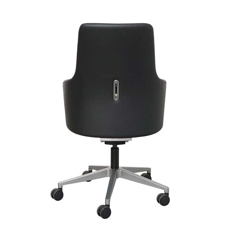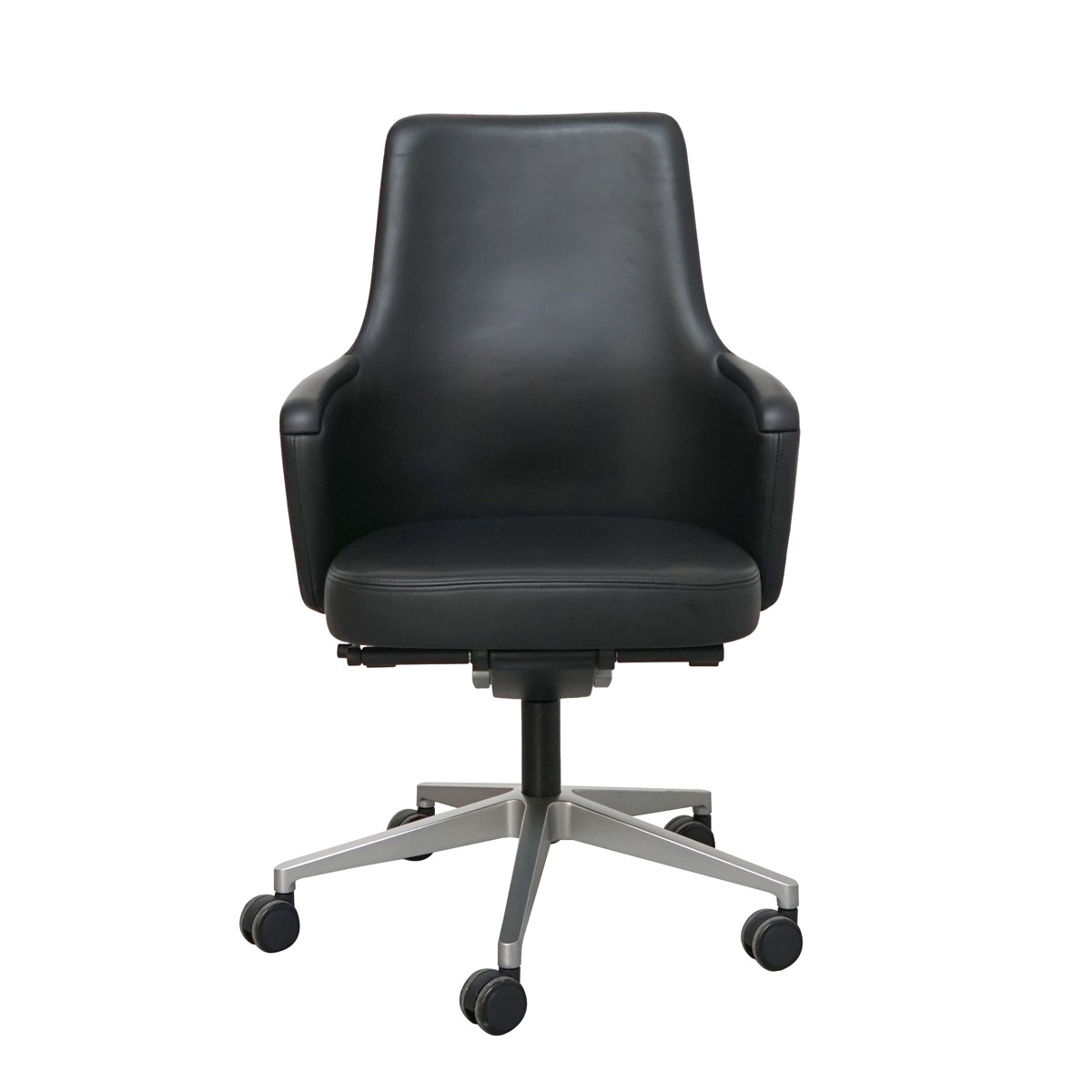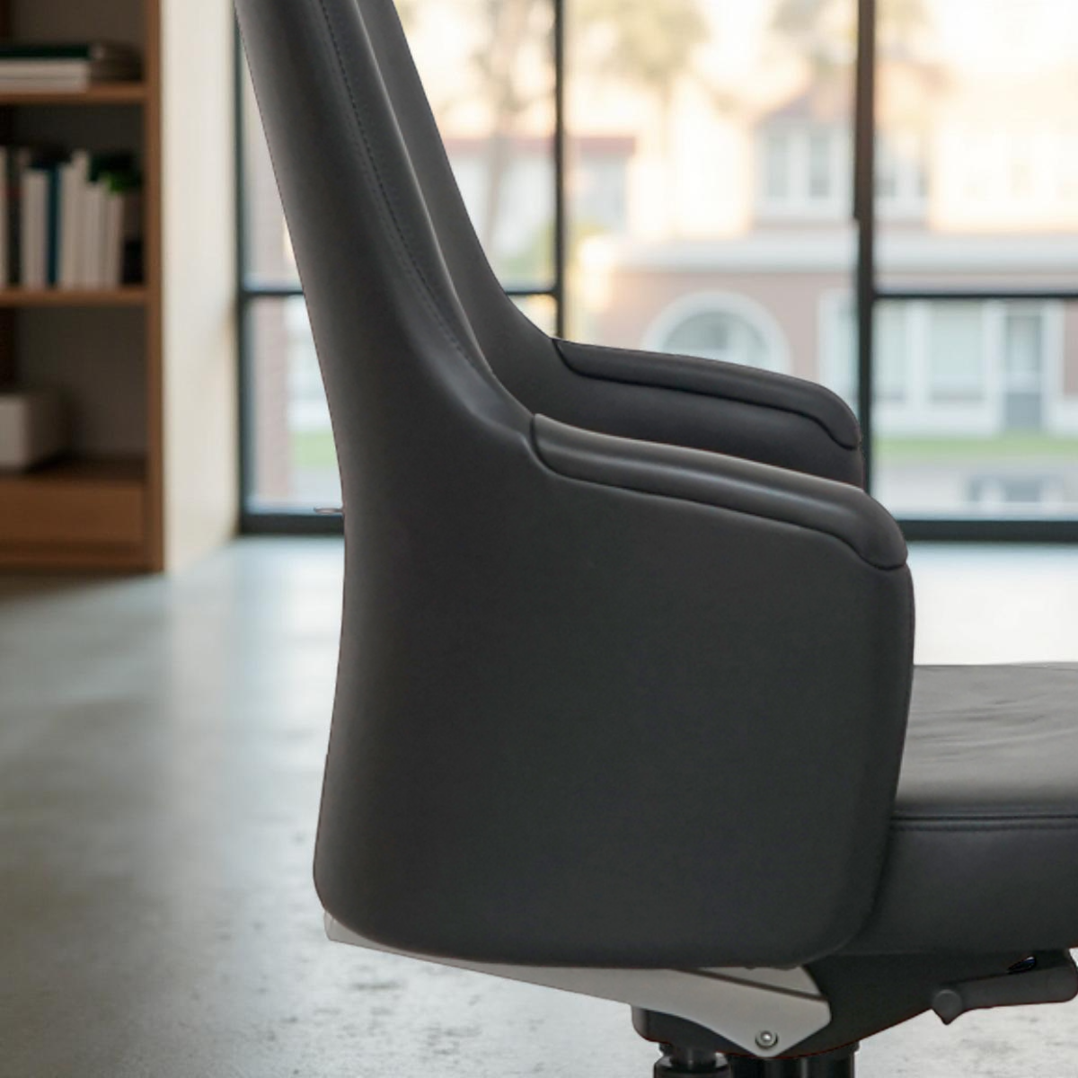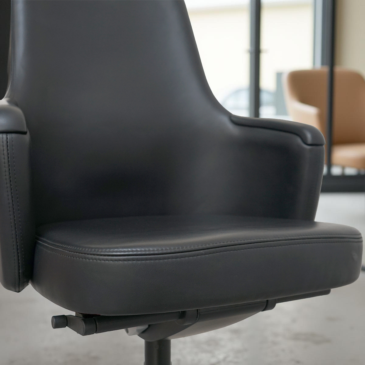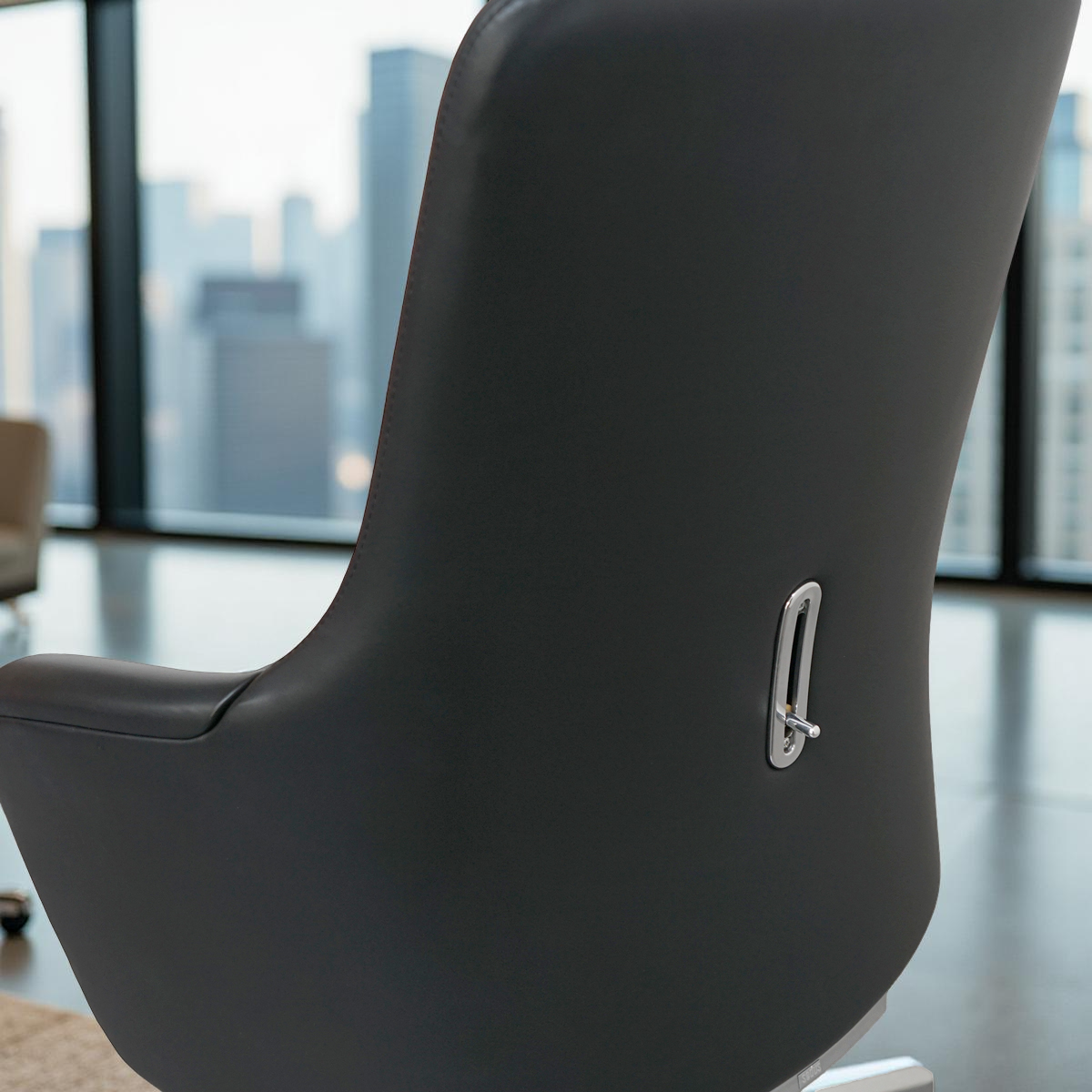 Este sillón giratorio ofrece un diseño elegante y cómodo, ideal para despachos, salas de reuniones o puestos operativos que buscan un toque profesional. Su estructura cuenta con una base giratoria cromada, que aporta resistencia, durabilidad y una estética premium. Tanto el asiento como el respaldo están tapizados en piel negra, ofreciendo un acabado sofisticado, profesional y fácil de mantener.