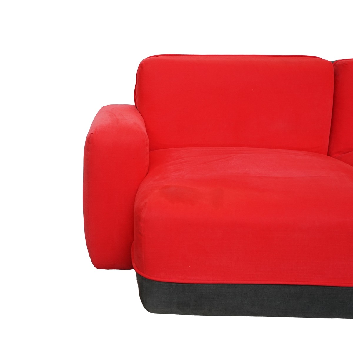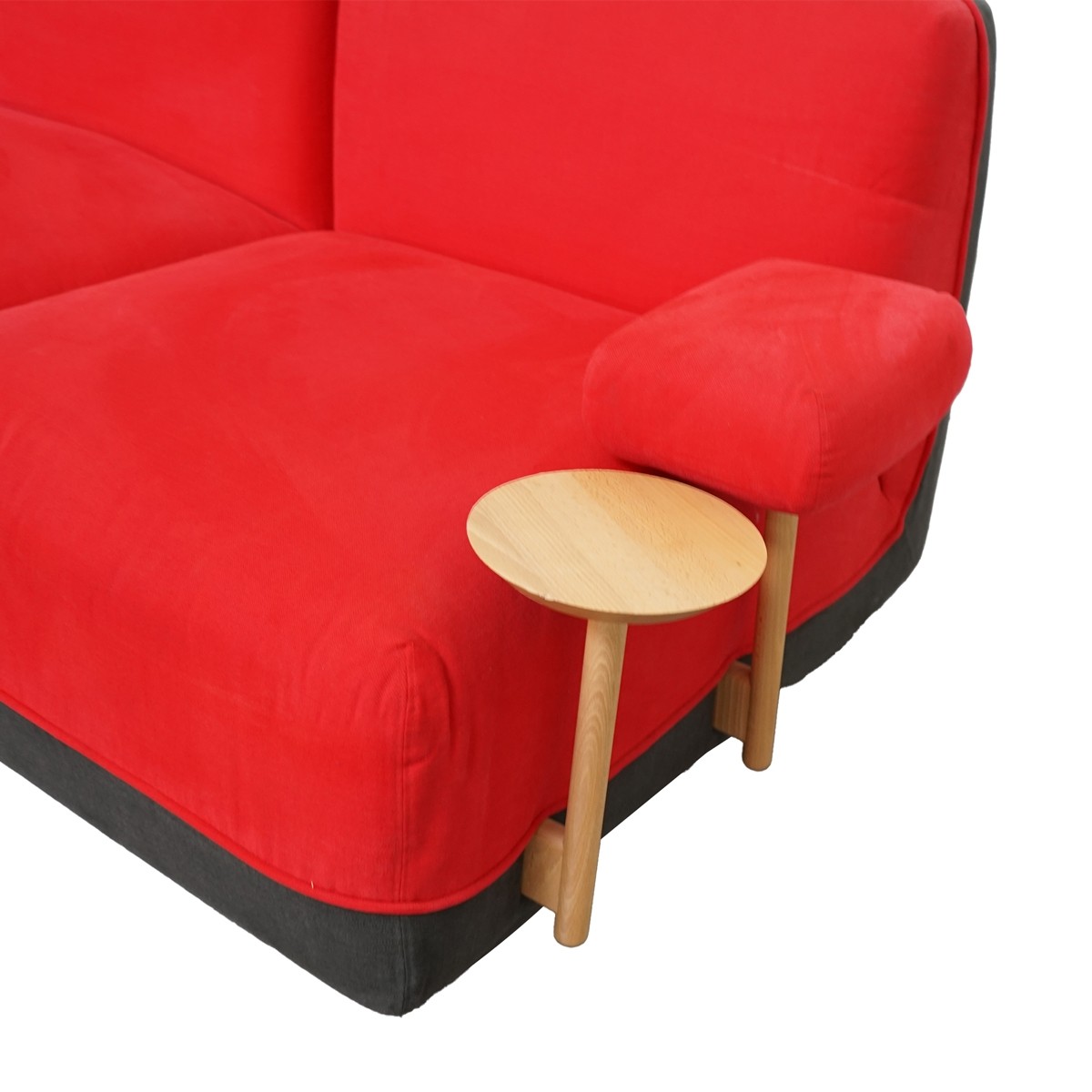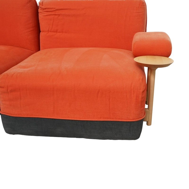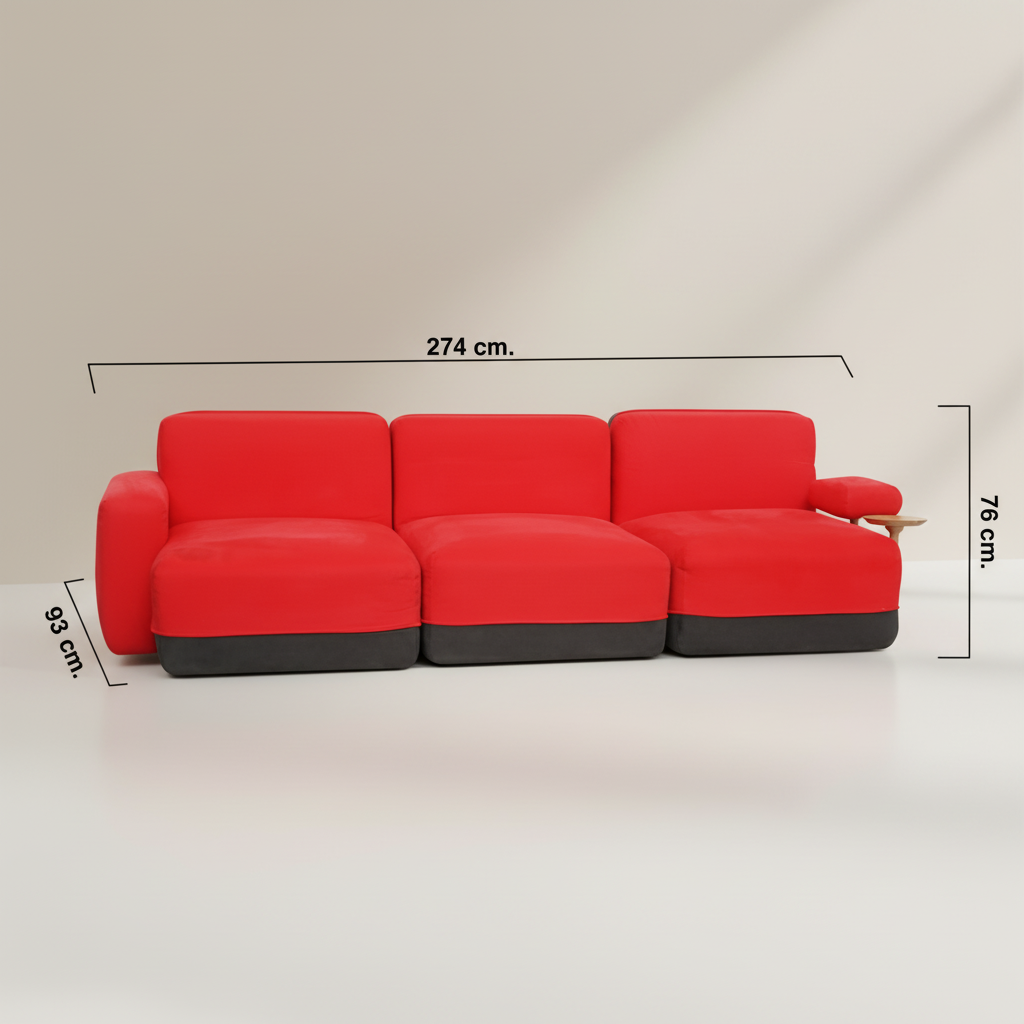 Su estética se define por una estructura delantera tapizada en tela de acabado naranja, rojo o amarillo mostaza, aportando un toque moderno y llamativo, combinada con la estructura trasera y baja en tela gris oscuro, que añade equilibrio y sofisticación al conjunto. El reposabrazos derecho completo, disponible también en naranja, rojo o amarillo mostaza, refuerza la personalidad del diseño, mientras que el reposabrazos izquierdo, más pequeño y equipado con un apoyo redondo de madera, introduce un detalle natural y funcional.