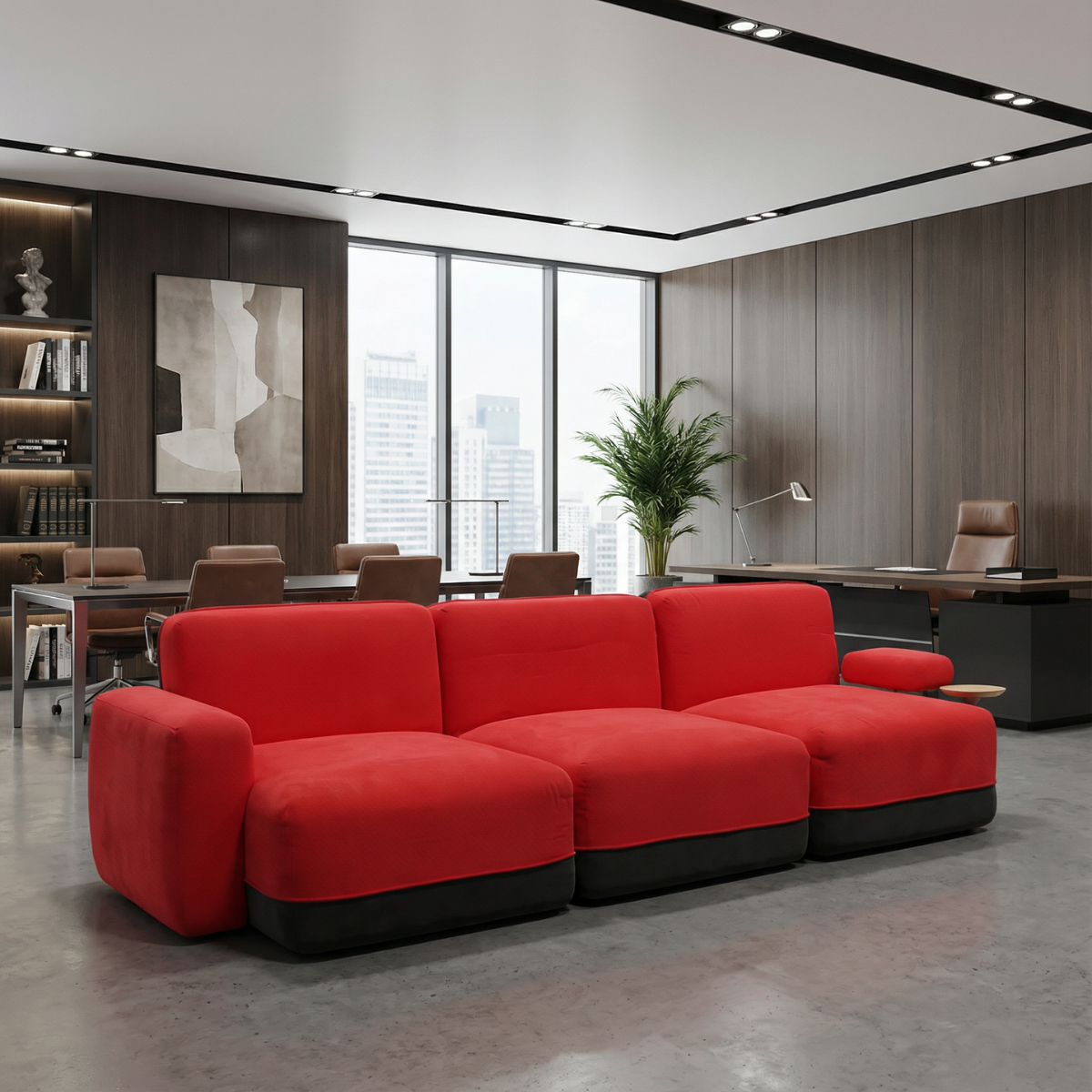 Una pieza amplia y distintiva para quienes buscan un sofá de diseño con carácter, capaz de transformar espacios de recepción o áreas comunes aportando estilo, comodidad y un ambiente acogedor.