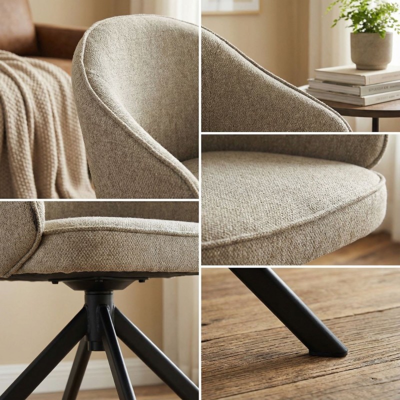 Su asiento y respaldo giratorios 360º ofrecen total libertad de movimiento, adaptándose a cualquier situación con fluidez y comodidad. Tapizados en un tejido marrón de alta calidad (acabado 12 Lukka), aportan una textura cálida y agradable al tacto, perfecta para ambientes acogedores.