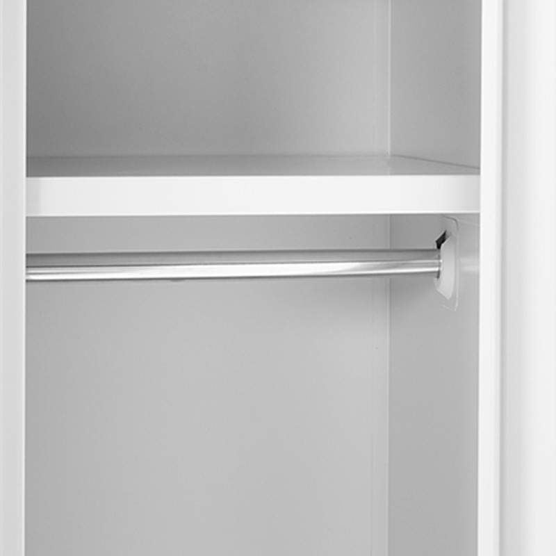 En su interior incluye dos estantes de acero, y una barra de acero inoxidable para colchar perchas.